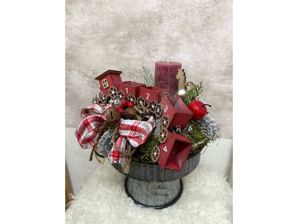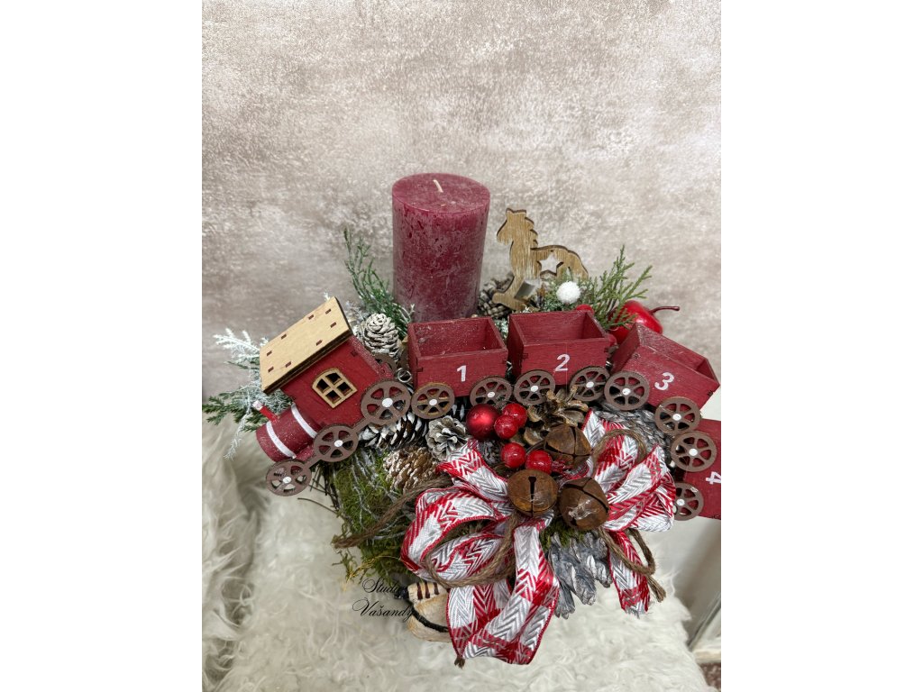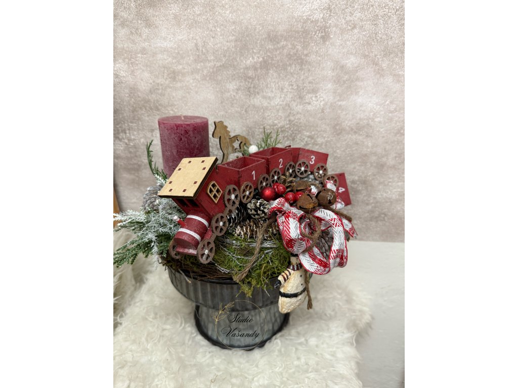 Kouzelná adventní dekorace naaranžovaná na plechové misce s podstavcem, která dodává celku rustikální a zároveň hravý vzhled. Dominantou je dřevěná vánoční mašinka s očíslovanými vagónky 1–4, symbolizující čtyři adventní neděle. U svíčky je doplněk dřevěný koník, pod ozdobnou mašlí se ukrývá roztomilý sněhulák a celé aranžmá krásně dotváří kovové rolničky.