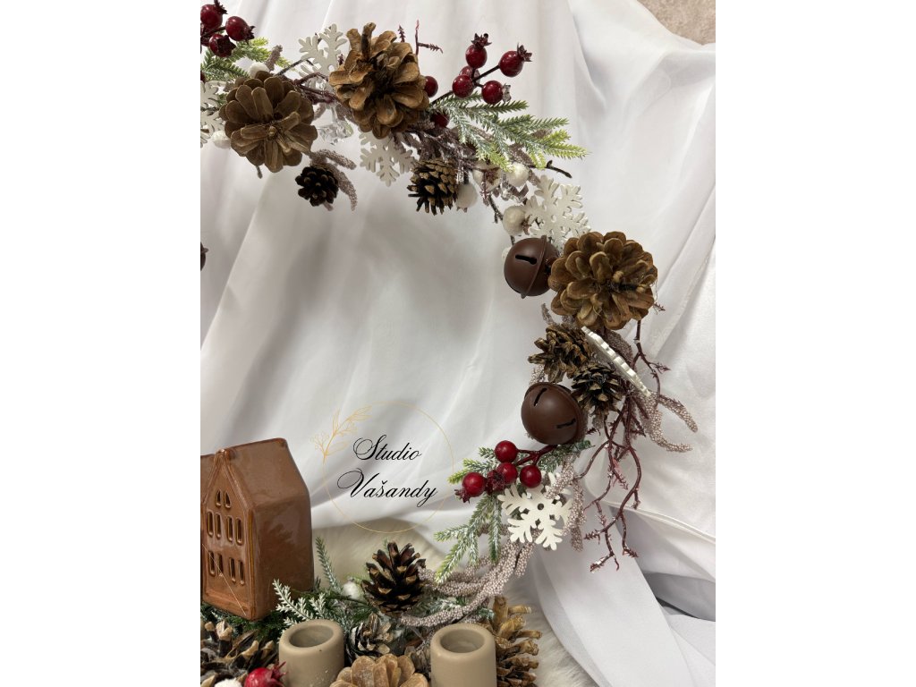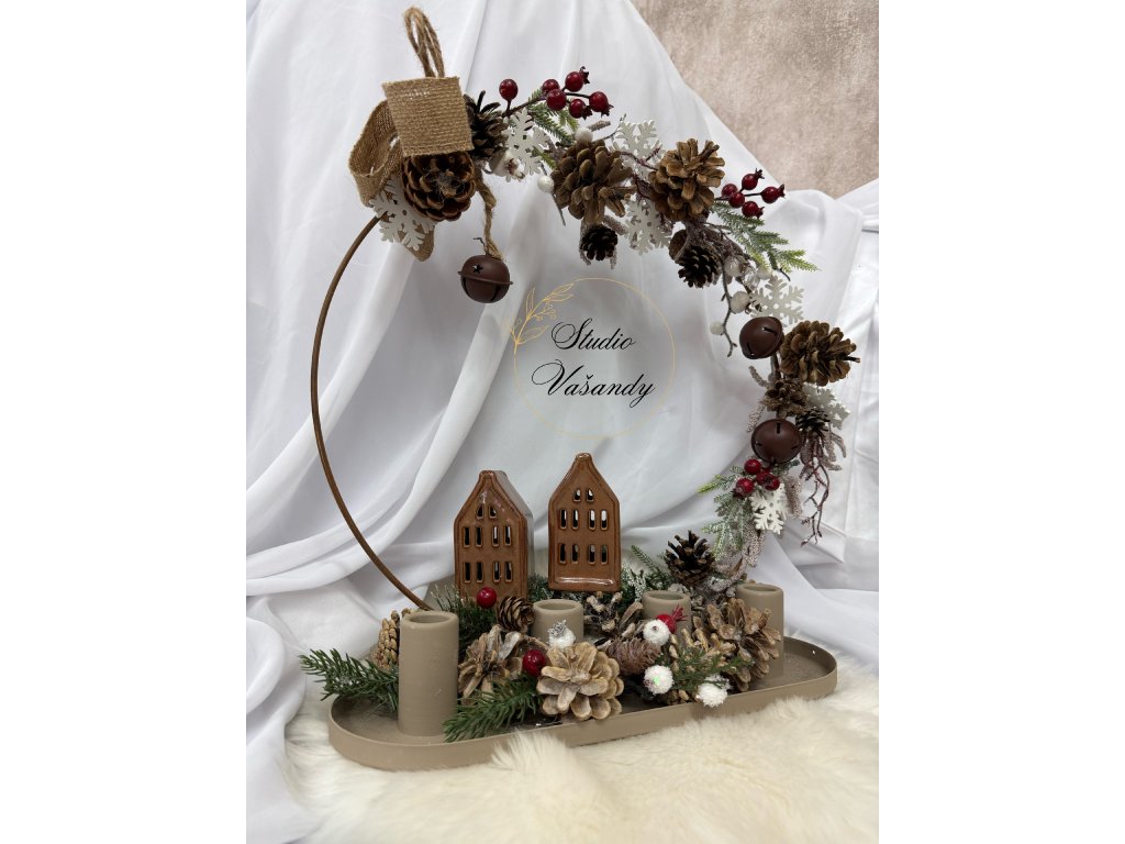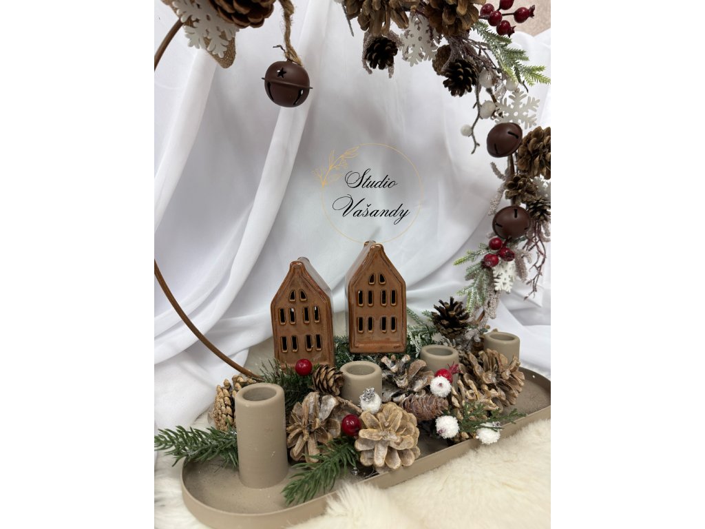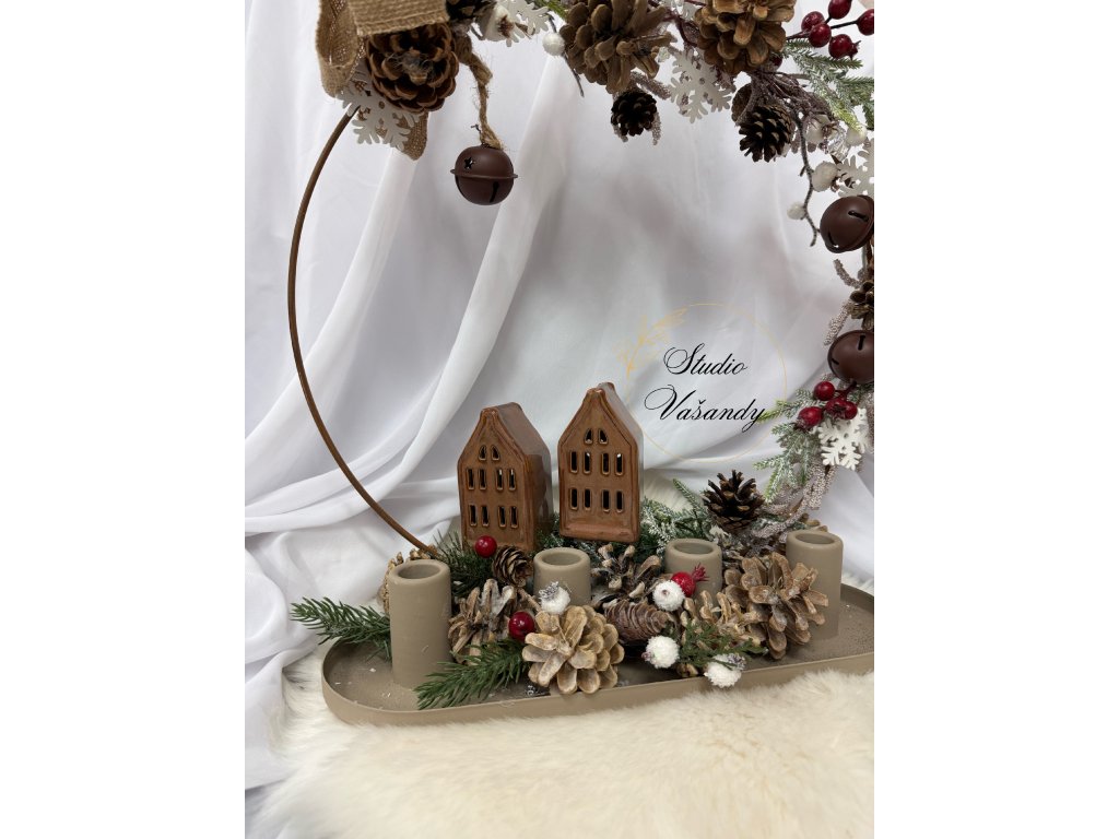Originální adventní věnec laděný do přírodních odstínů hnědé a béžové. Zdobený šiškami, bobulemi, větvičkami a kovovým kruhem s rolničkami. Uprostřed doplněn o dvě keramické domečky, které vytvářejí útulnou vánoční atmosféru. Pro čtyři svíčky.
