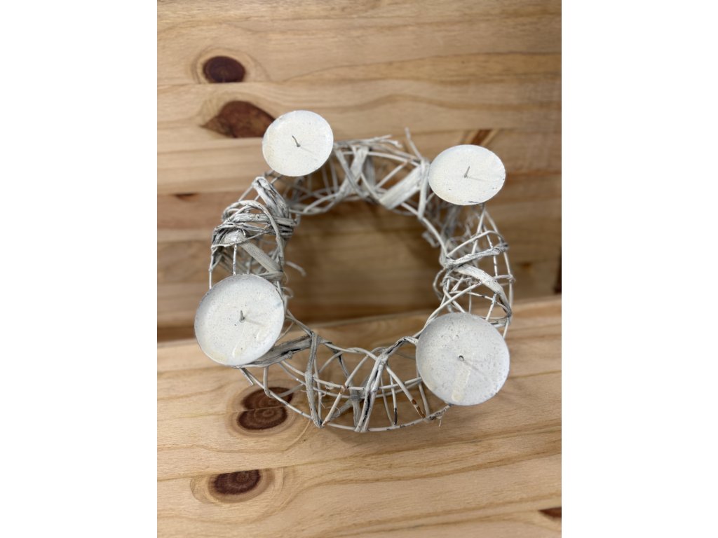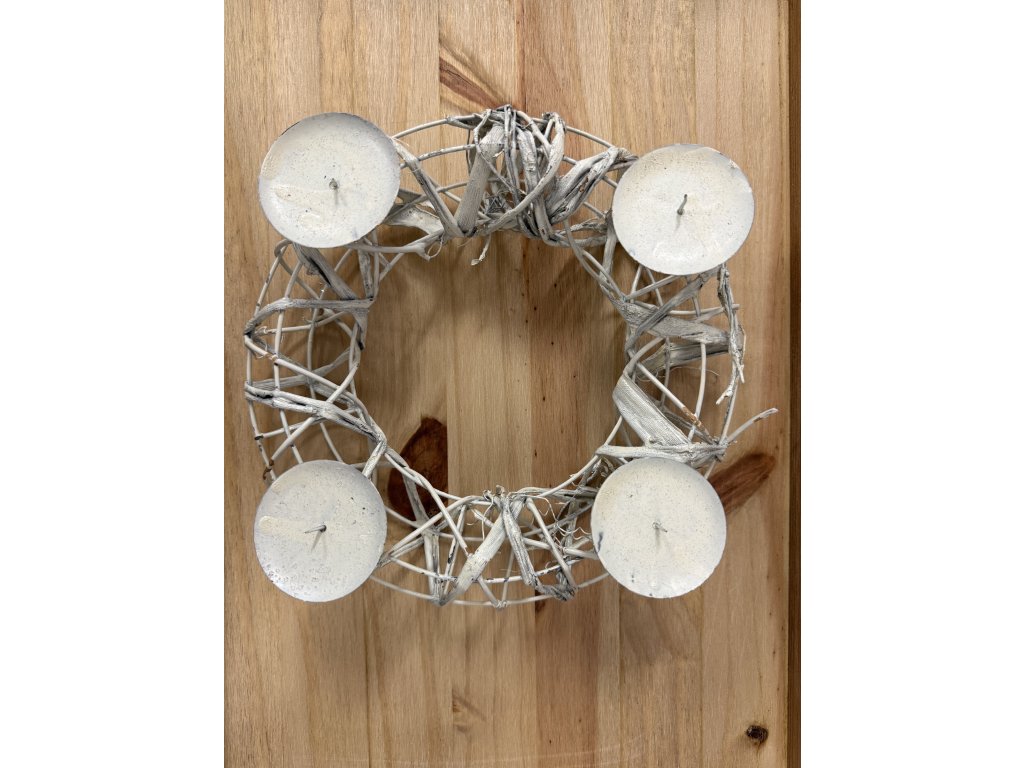 Jednoduchý bílý kovový (proutěný) adventní věnec bez svíček, který můžete dozdobit podle vlastního stylu. Skvělý základ pro vytvoření originální adventní dekorace – stačí přidat svíčky, ozdoby nebo větvičky.