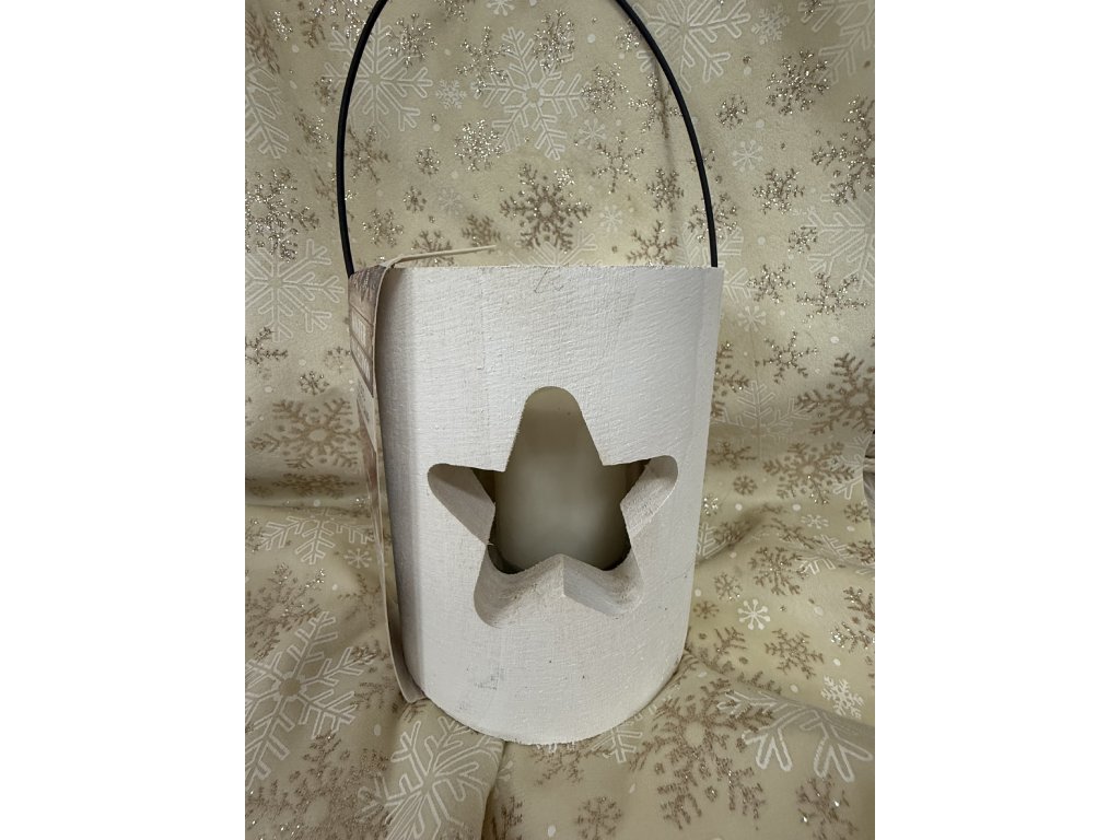 Bílá lucerna se svíčkou, vyřezaná hvězda. Svíčka vydrží hořet +/- 30 hodin. Výška: 15 cm