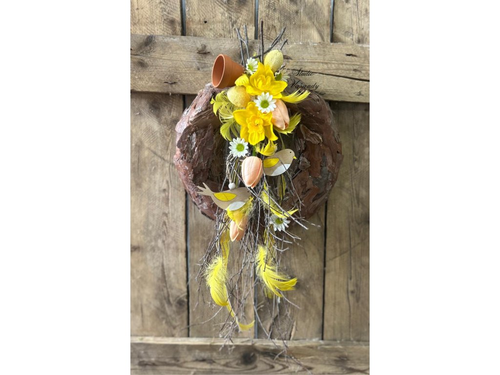 Celkový vzhled doplňuje terakotový květináč, dřevění ptáčci a žlutá rypsová stuha, která věnec krásně rozzáří. Ideální jako jarní nebo velikonoční dekorace na dveře, zeď či do interiéru.