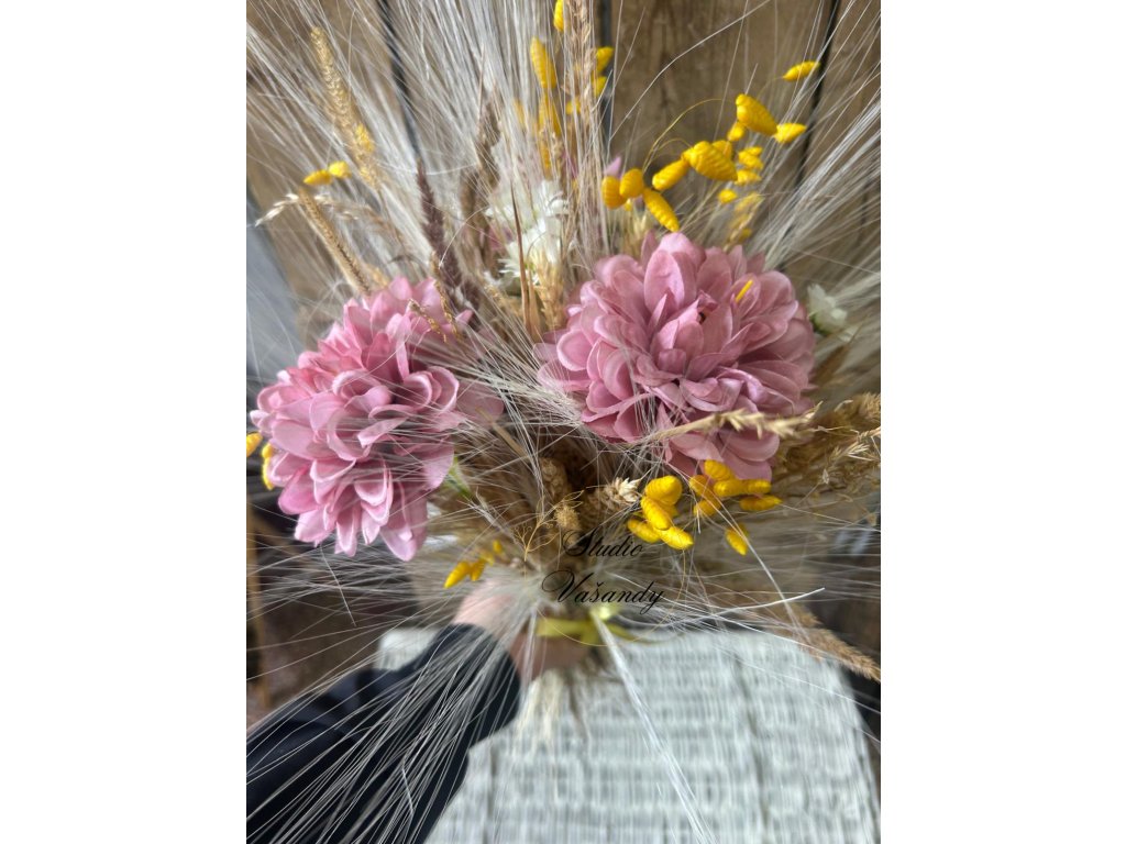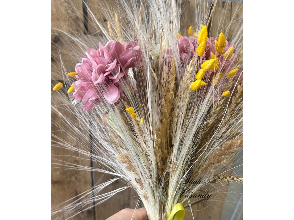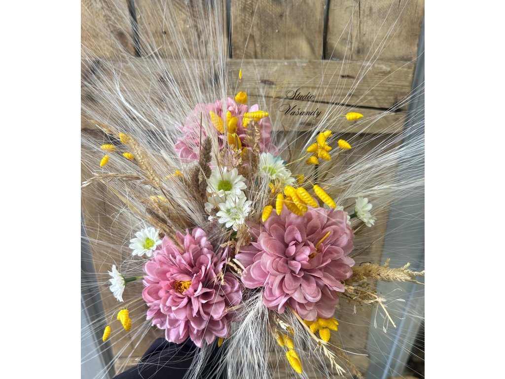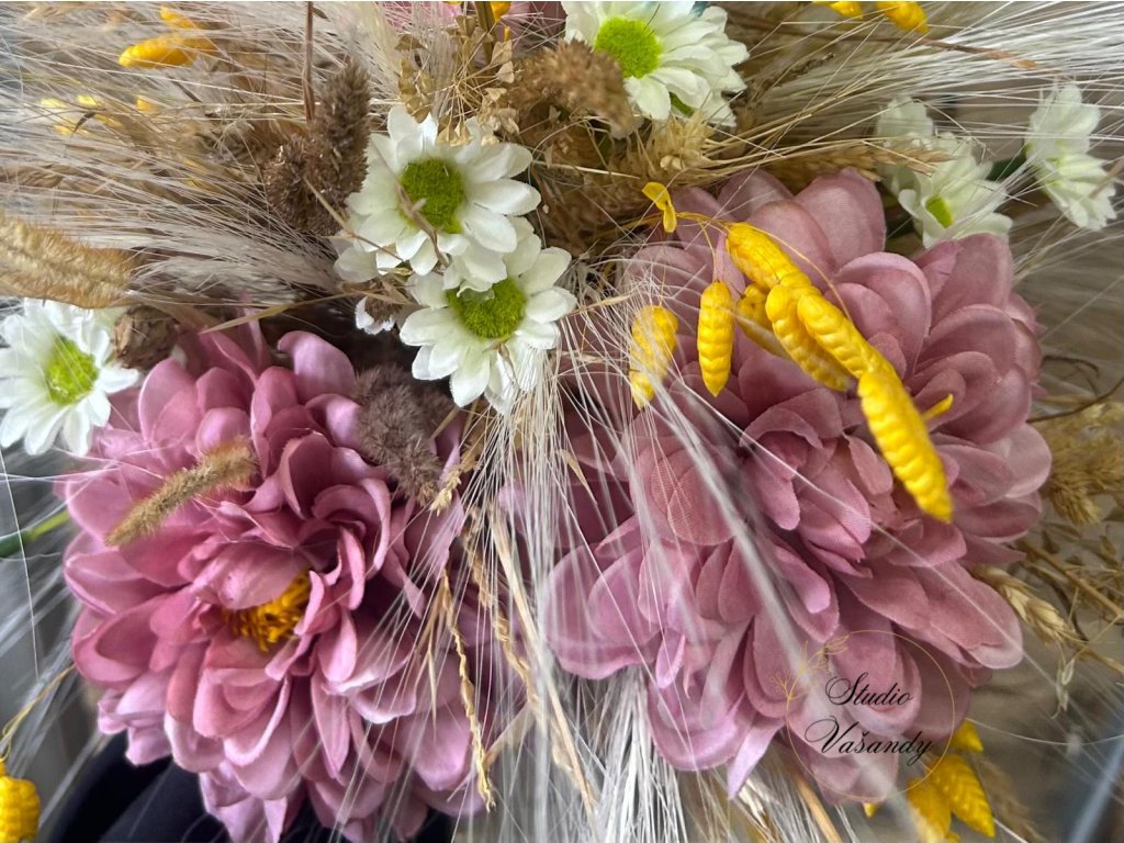 Kombinace umělých květin a sušiny v jemných růžových a žlutých tónech vytváří svěží, veselou dekoraci, která rozzáří každý prostor. Kytice je svázaná žlutou saténovou stuhou a působí lehce, přirozeně a radostně.