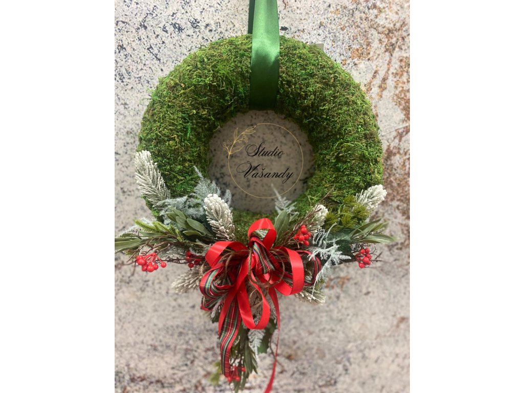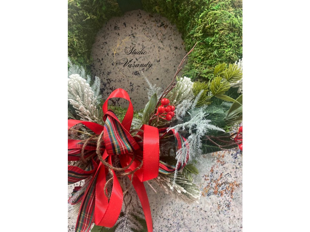 Vánoční věnec s mechem je zdoben bohatými zelenými větvičkami, sněhovými akcenty, červenými bobulemi a stylovou mašlí s tartanovým vzorem. Díky zelené stuze je připraven k zavěšení na dveře či zeď, kde vytvoří dokonalou vánoční atmosféru. Skvělý doplněk na zimní období nebo jako dárek.