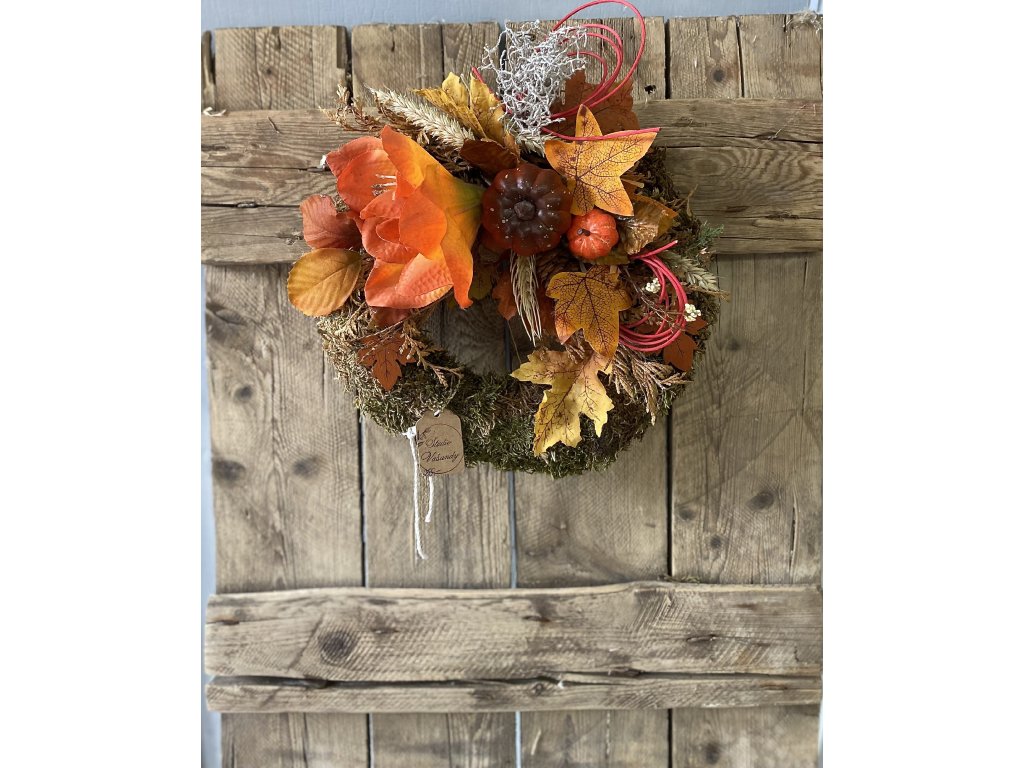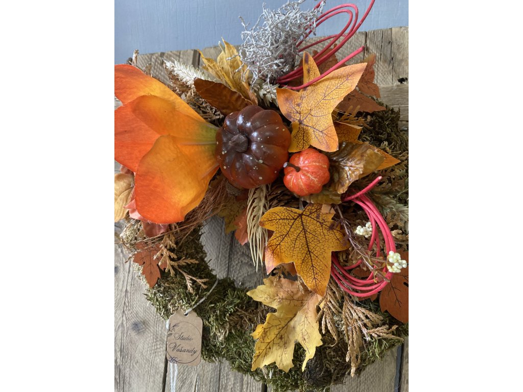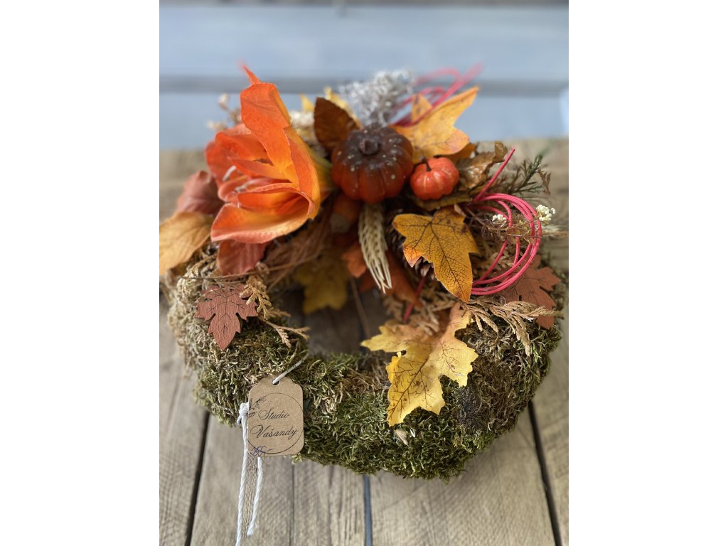 Mechový věnec - slaměný korpus dozdoben umělými podzimními listy, umělá květina Amarylis, um. dýněmi.