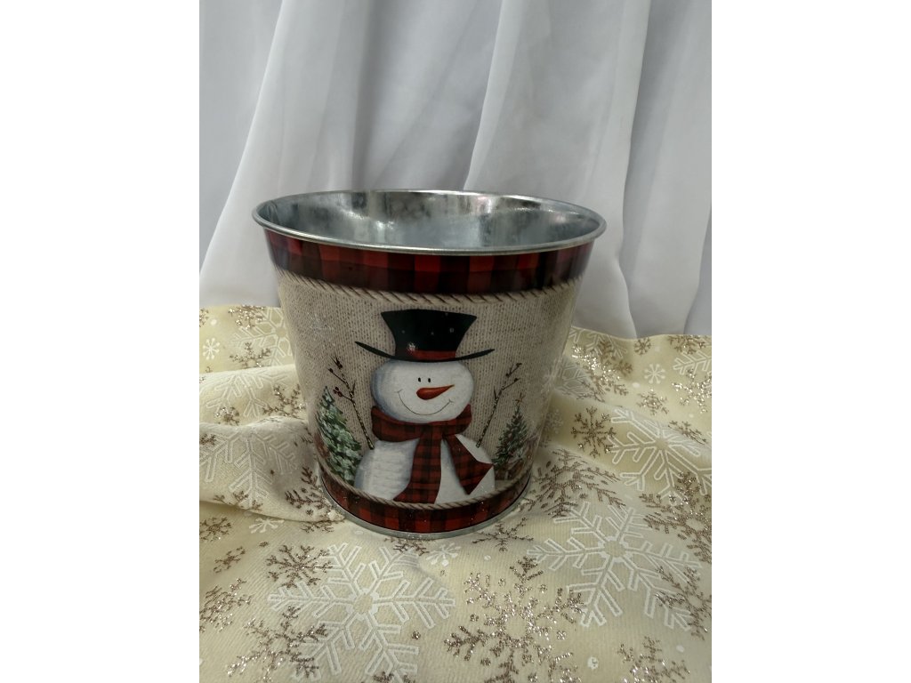 Plechový květináč s veselým zimním motivem sněhuláka, vánočního stromku a dárků. Ideální pro vytvoření sváteční atmosféry doma i venku. Může sloužit jako obal na květiny, chvojí nebo základ pro vlastní zimní aranžmá.