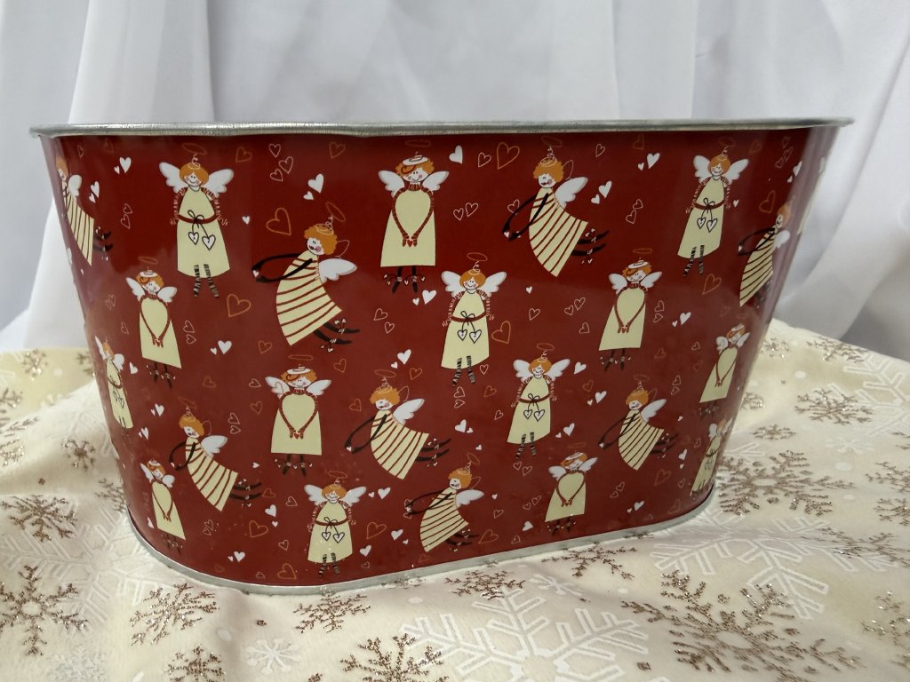 Plechový květináč v červené barvě s veselým motivem andílků. Ideální jako zimní dekorace nebo jako základ pro vytvoření vlastního aranžmá. Skvěle se hodí na stůl, okenní parapet či komodu.