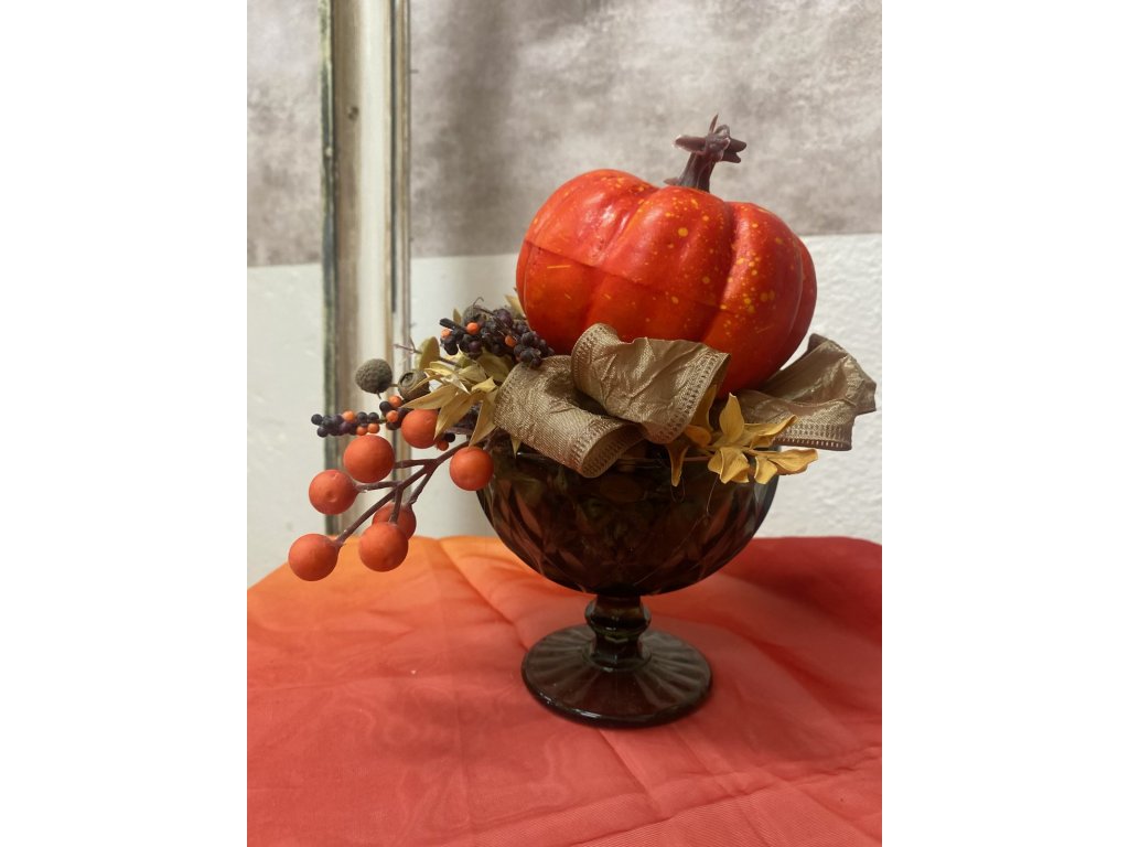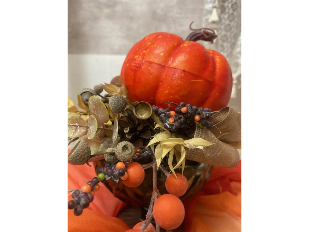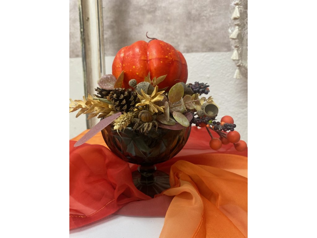 Podzimní dekorace v zeleném skleněném poháru , umělé dekorace, saténová stuha a přírodniny .