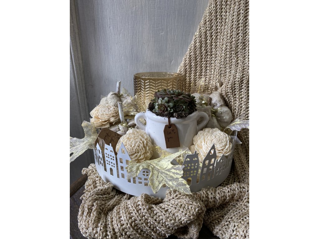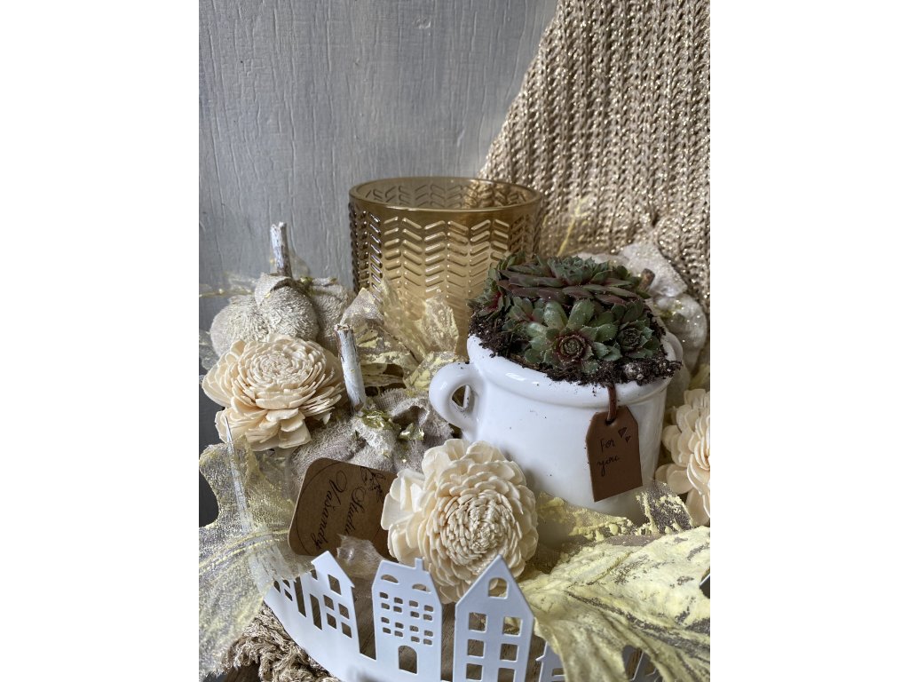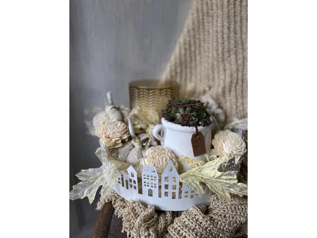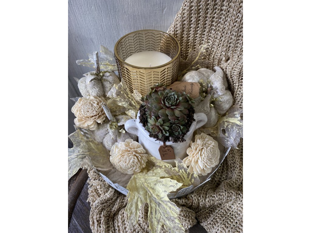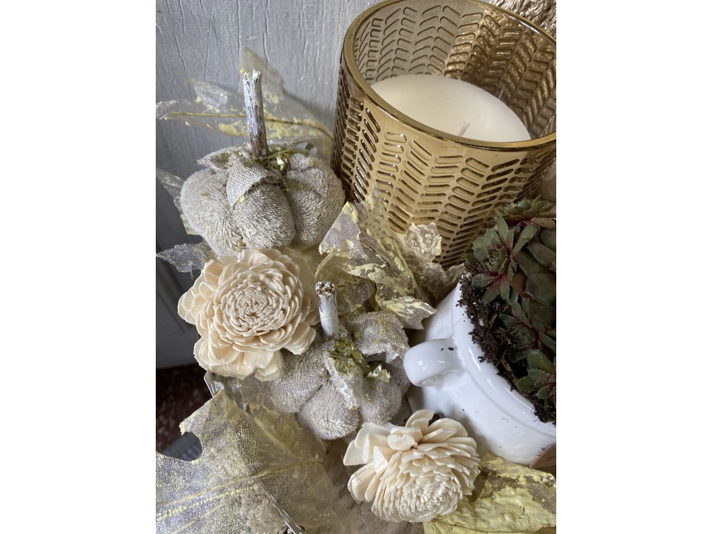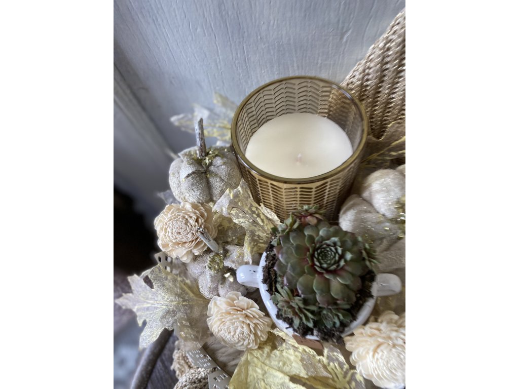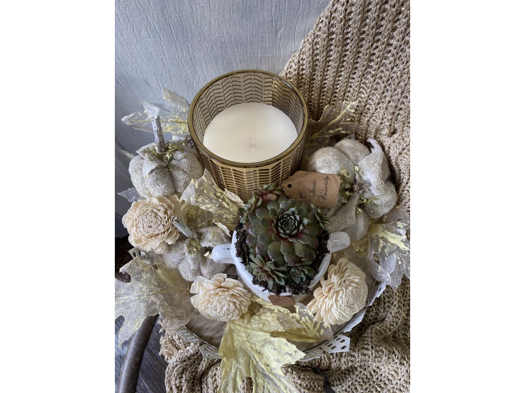 Vonná svíčka , 3 dýně , keramický květináček se sukulentem , podzimní listy a dřevěné květy . Krásná podzimní dekorace do světlého interiéru nebo jako dárek.