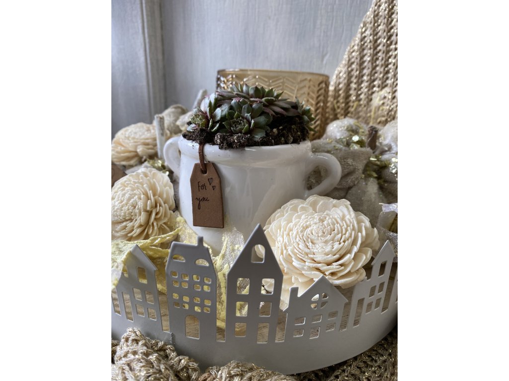 Plechový tác s domečky, doaranžovaný do smetanovozlaté barvy.Výška ( svíčky ) 15 cm