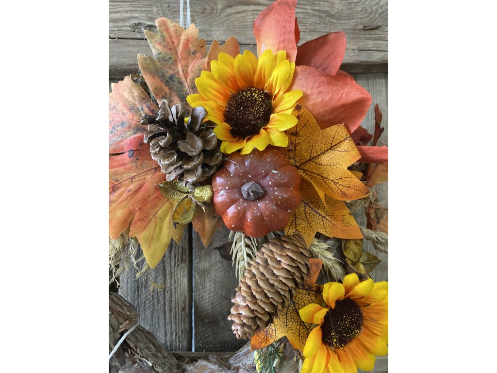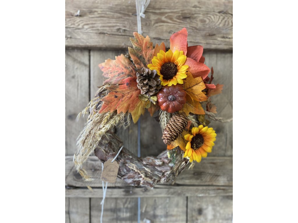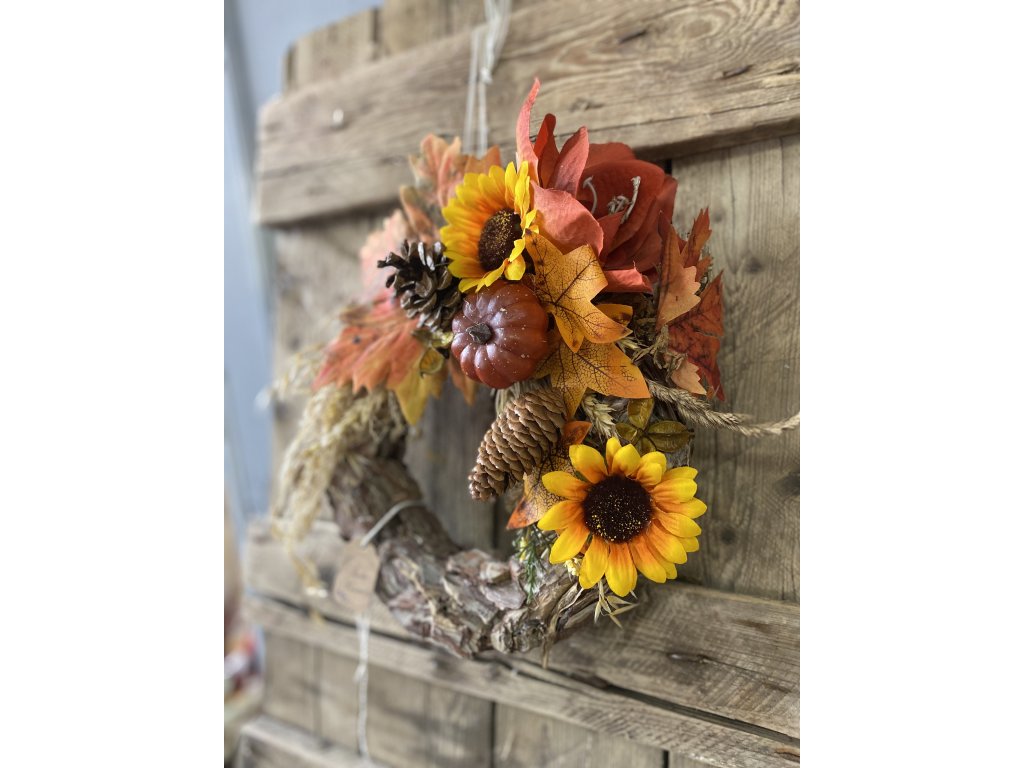 Věnec ze slaměného korpusu ozdoben kůrou, umělými slunečnicemi, květem Amarylisu, podzimními listy a sušenými travinami