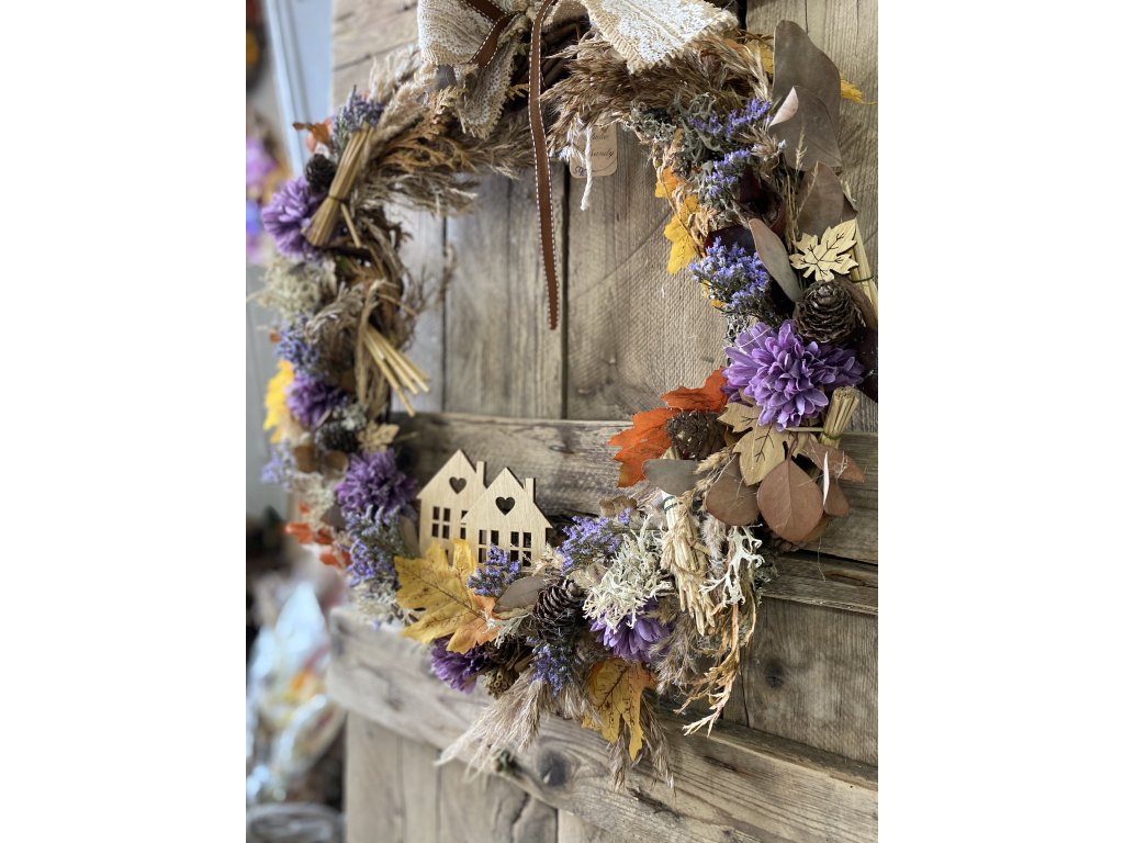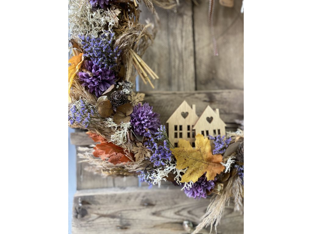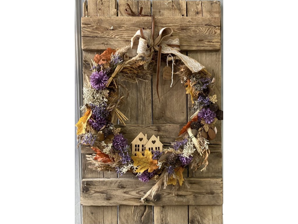 Věnec zdoben dřevěnými domečky, přírodninami a umělými květy