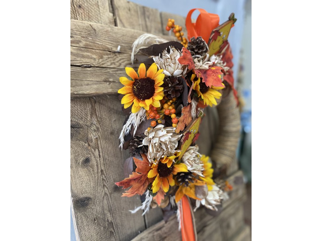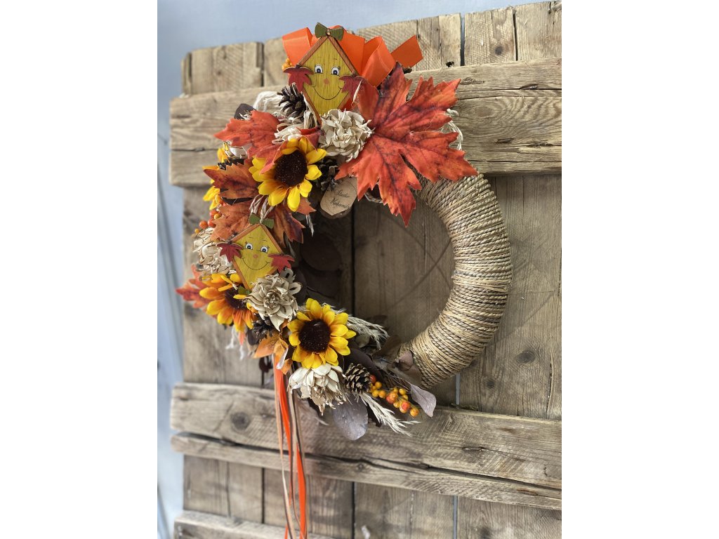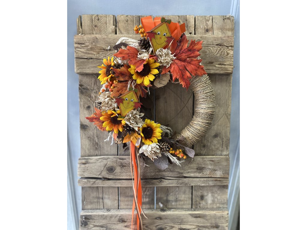 Věnec se skládá ze slaměného korpusu, provazu, z dřevěných draků, umělé barevné listy, umělé slunečnice, stabilizovaný eukalypt, sušiny, umělé květy, přírodniny a stuhy.