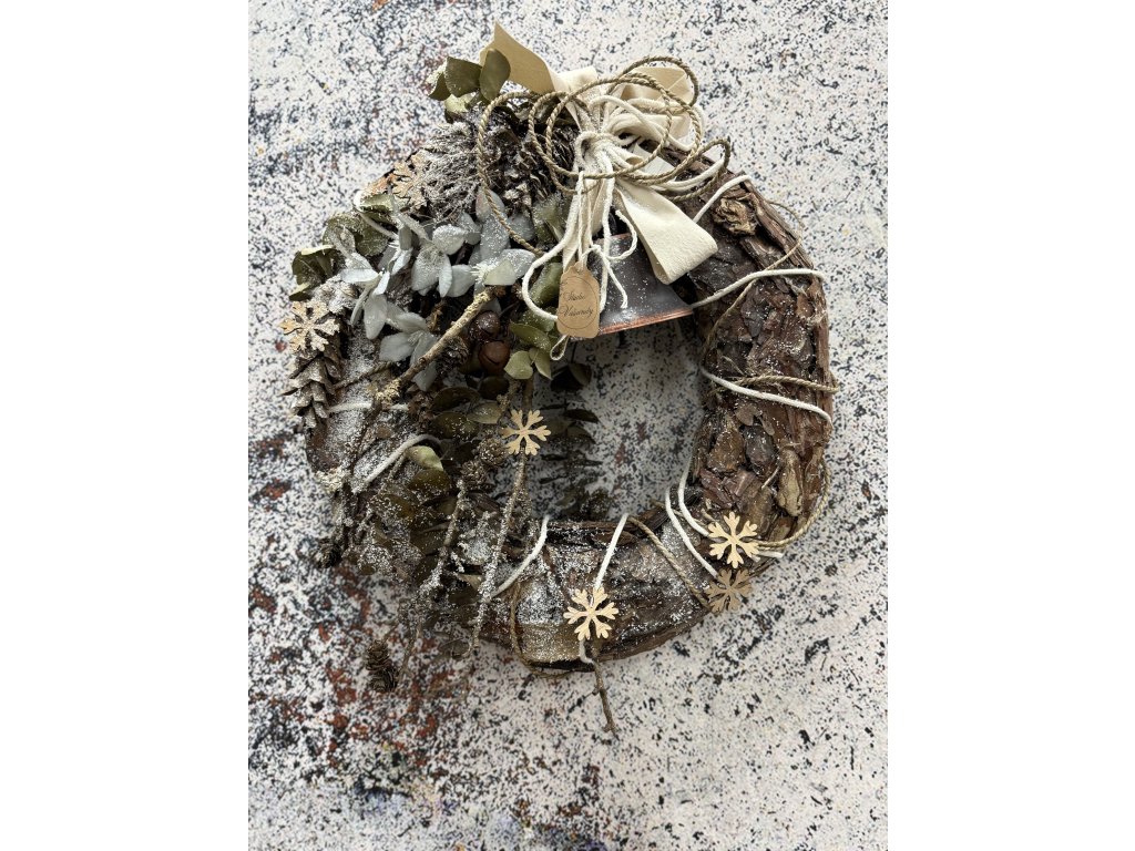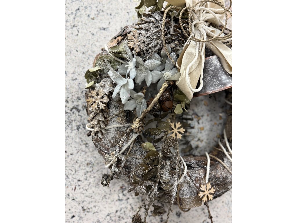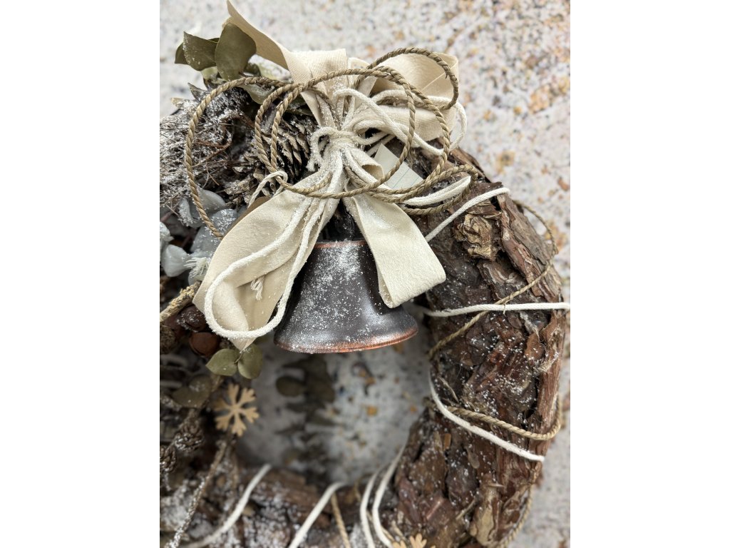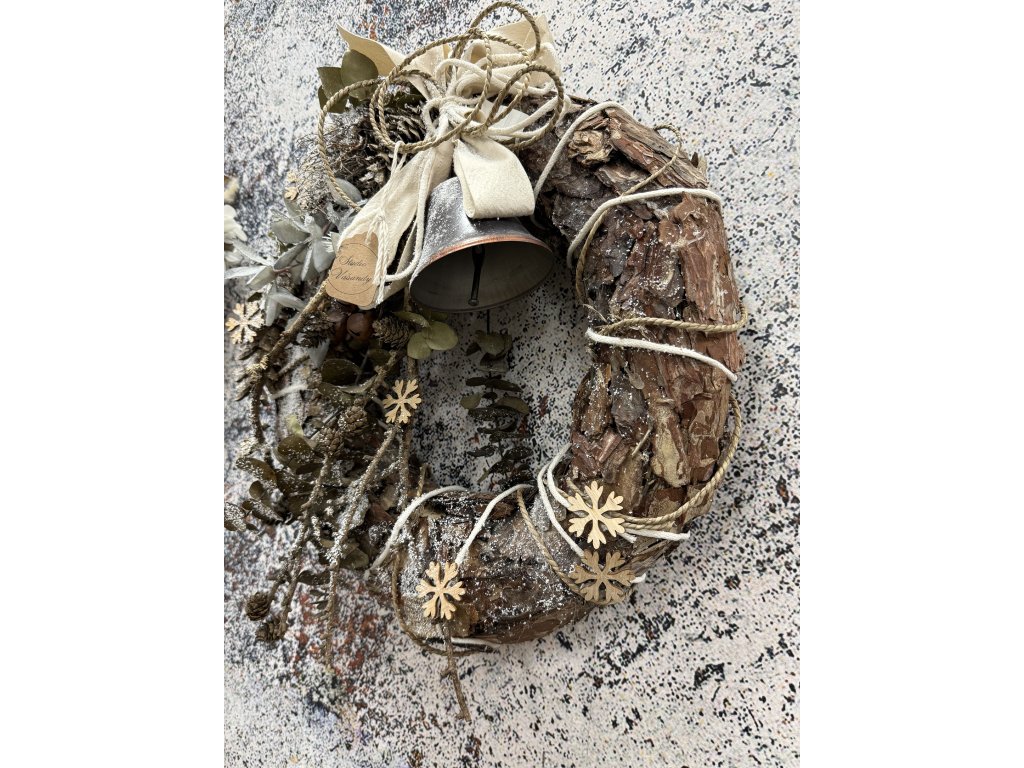 Přírodní věnec se zvonkemVěnec na dveřeKůrový věnec s kovovým zvonkem, stabilizonaný eukalypt a uměle květyPrůměr 40 cm