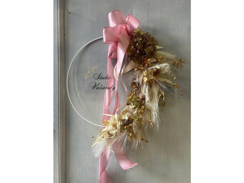 Doplněný růžovou a smetanovou saténovou stuhou, která mu dodává lehký romantický vzhled. Vhodný na dveře i do interiéru. Každý kus je originál.