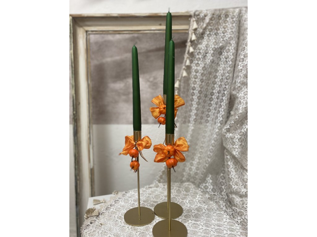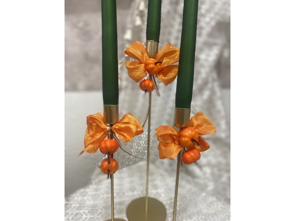 Sada 3 ks zlatých svícnů se zelenými svíčkami a dýněmi. kompletní sada.