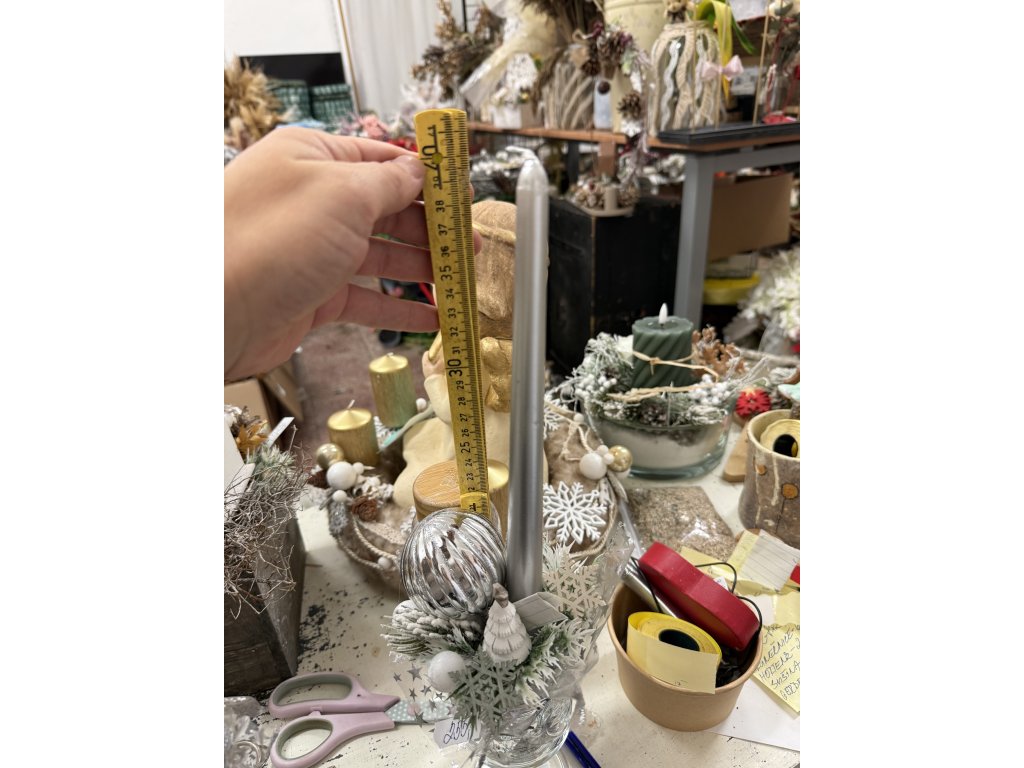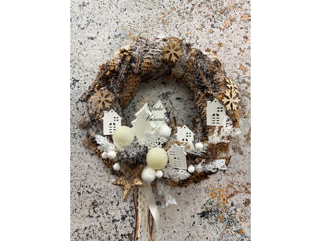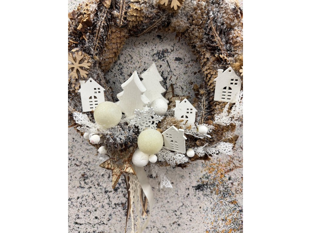 Šiškový věnec o průměru 30 cm, stuha je dlouhá 50 cm od věnce dolů.