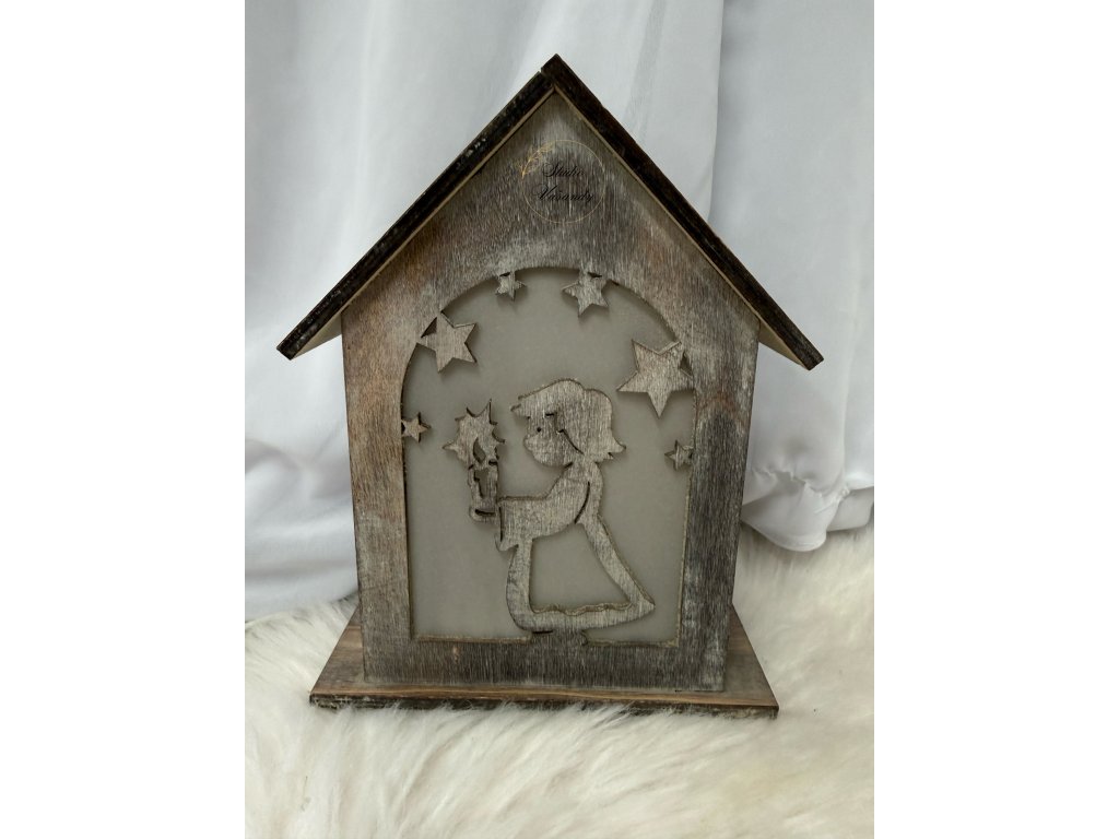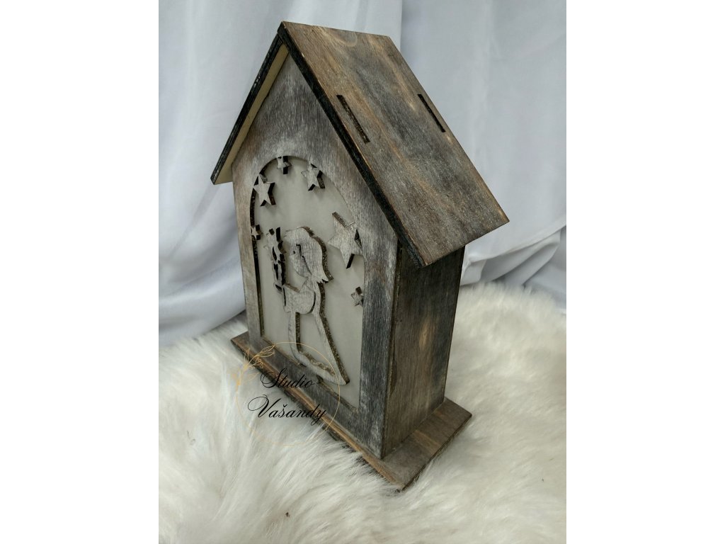 Dekorativní dřevěný domeček s motivem andílka a hvězd.