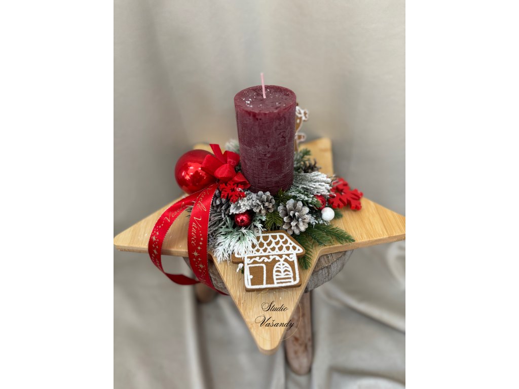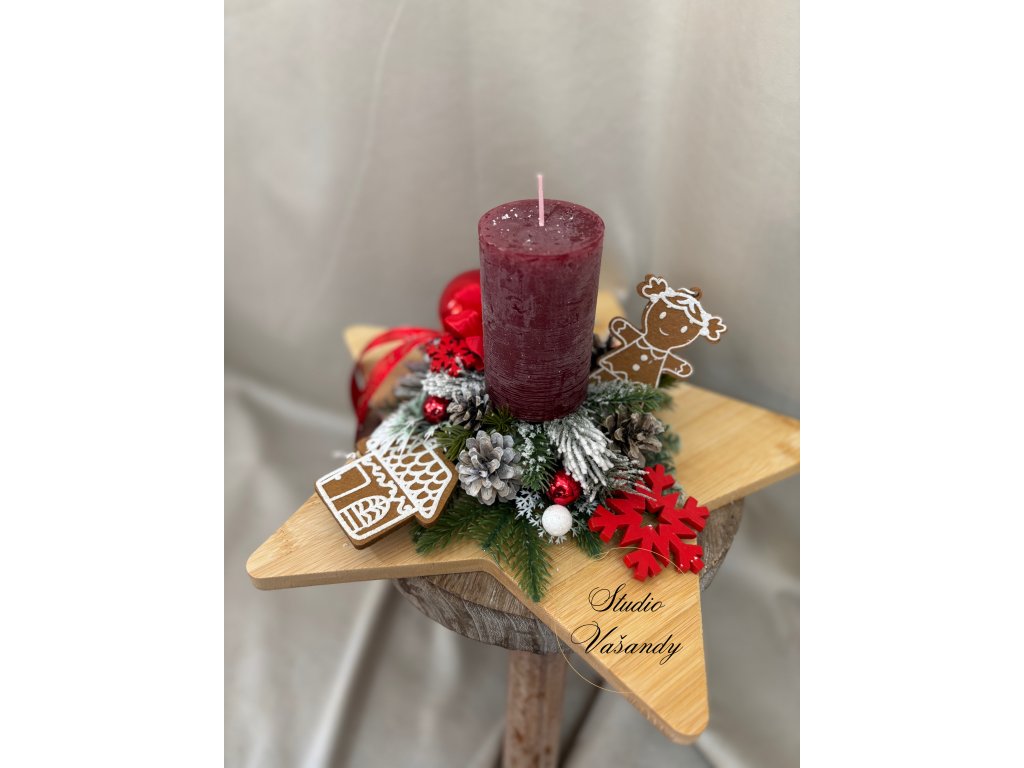 Tato vánoční dekorace je naaranžována na podstavci ve tvaru hvězdy z přírodního dřeva. Dominantou je vysoká červená svíčka, kterou obklopují zasněžené větvičky, šišky, červené baňky, dřevěné vločky a umělý perníkový domeček. Aranžmá doplňuje roztomilá perníčková holčička, která dodává dekoraci tradiční a hravý vánoční nádech.
