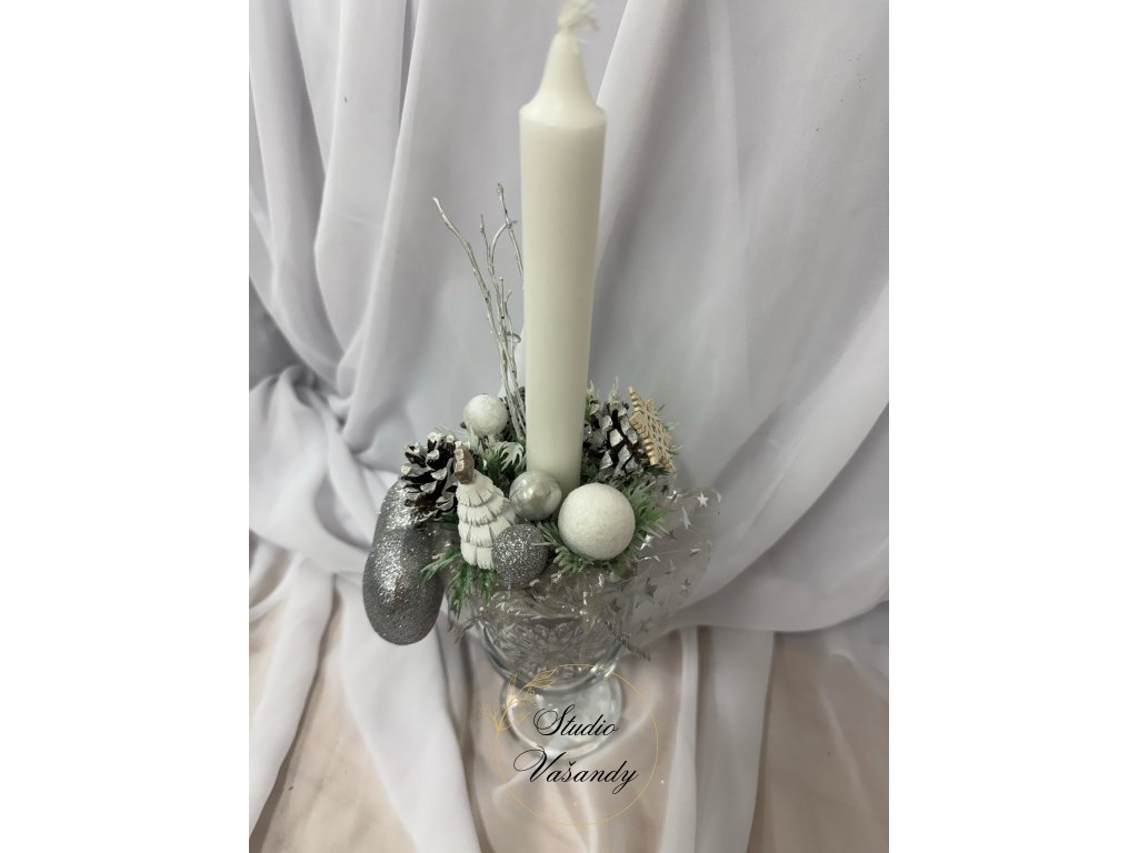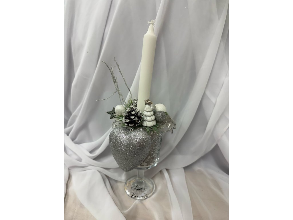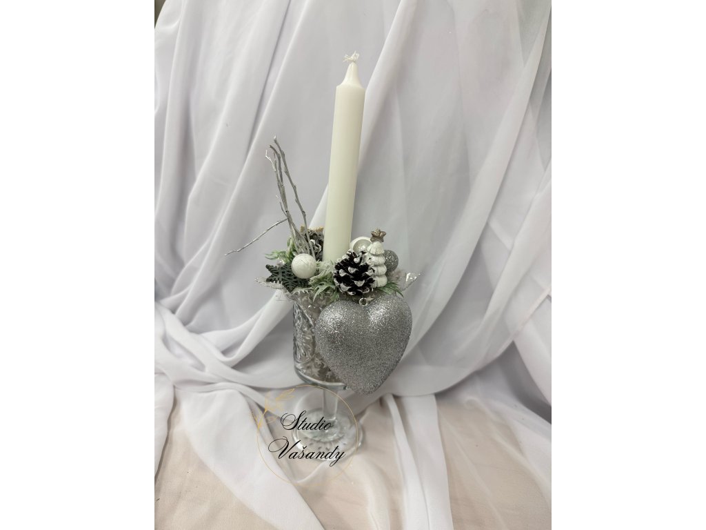 Jemný vánoční svícínek ve skleněném pohárku, laděný do stříbrné a bílé barvy. Dominantou je vysoká bílá svíčka, obklopená zimními ozdobami – lesklým srdíčkem umělými větvičkami, vločkovými detaily a dekorativní hvězdnou fólií. Tato elegantní dekorace je ideální pro sváteční stůl nebo poličku a přináší vánoční kouzlo do každého interiéru.