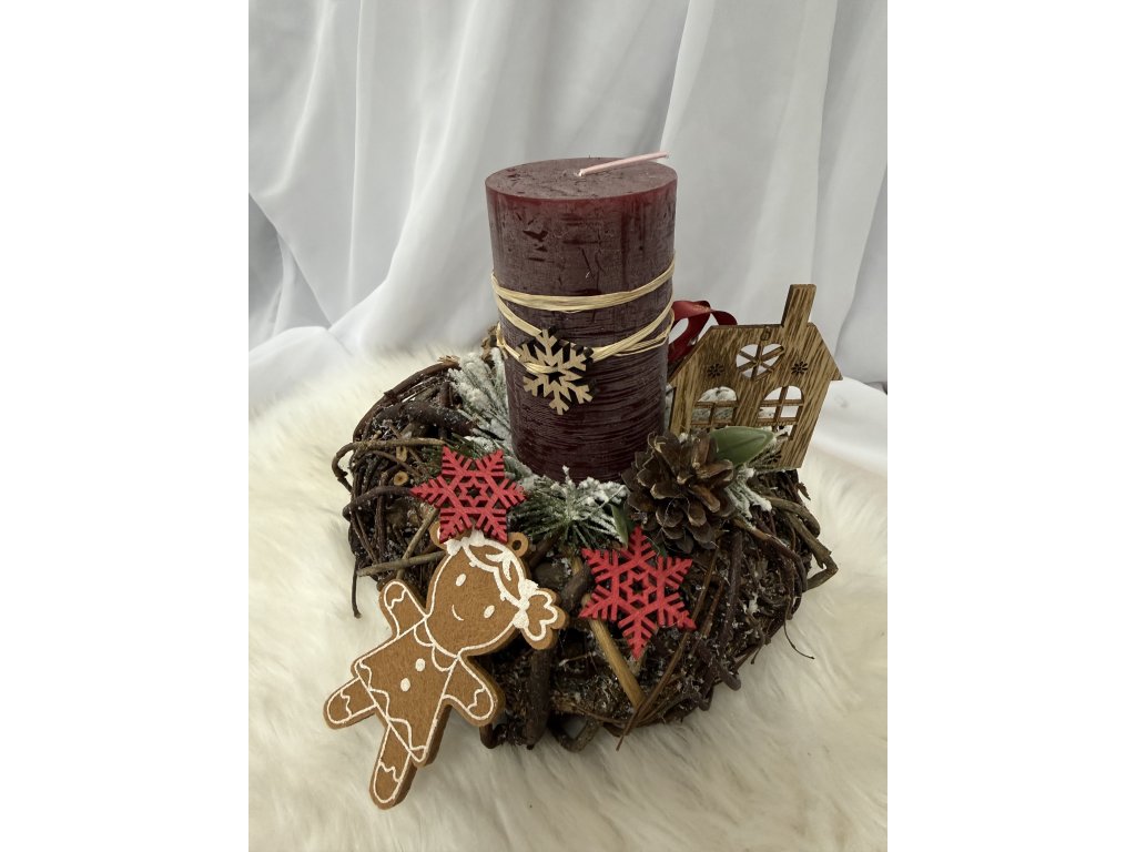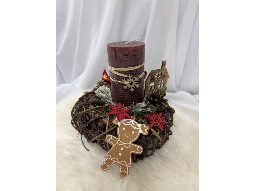 Kouzelná vánoční dekorace v přírodním stylu s červenou svíčkou, která je dozdobená dřevěnou vločkou. Základ tvoří proutěný věnec doplněný o malý domeček, šišky, zelené větvičky, červené vločky a roztomilou perníčkovou ozdobu.