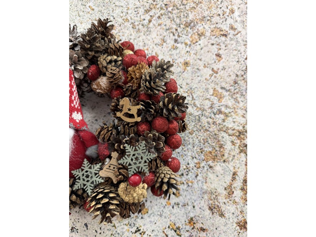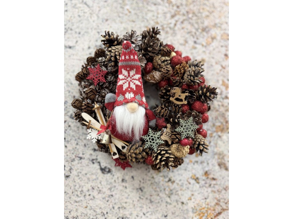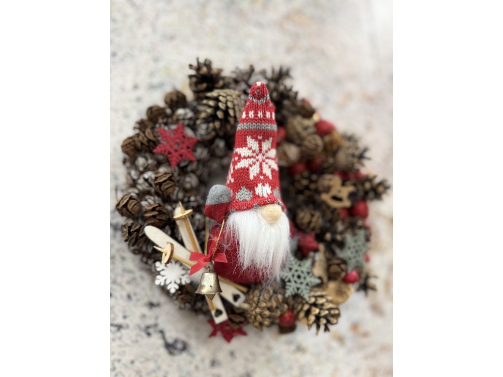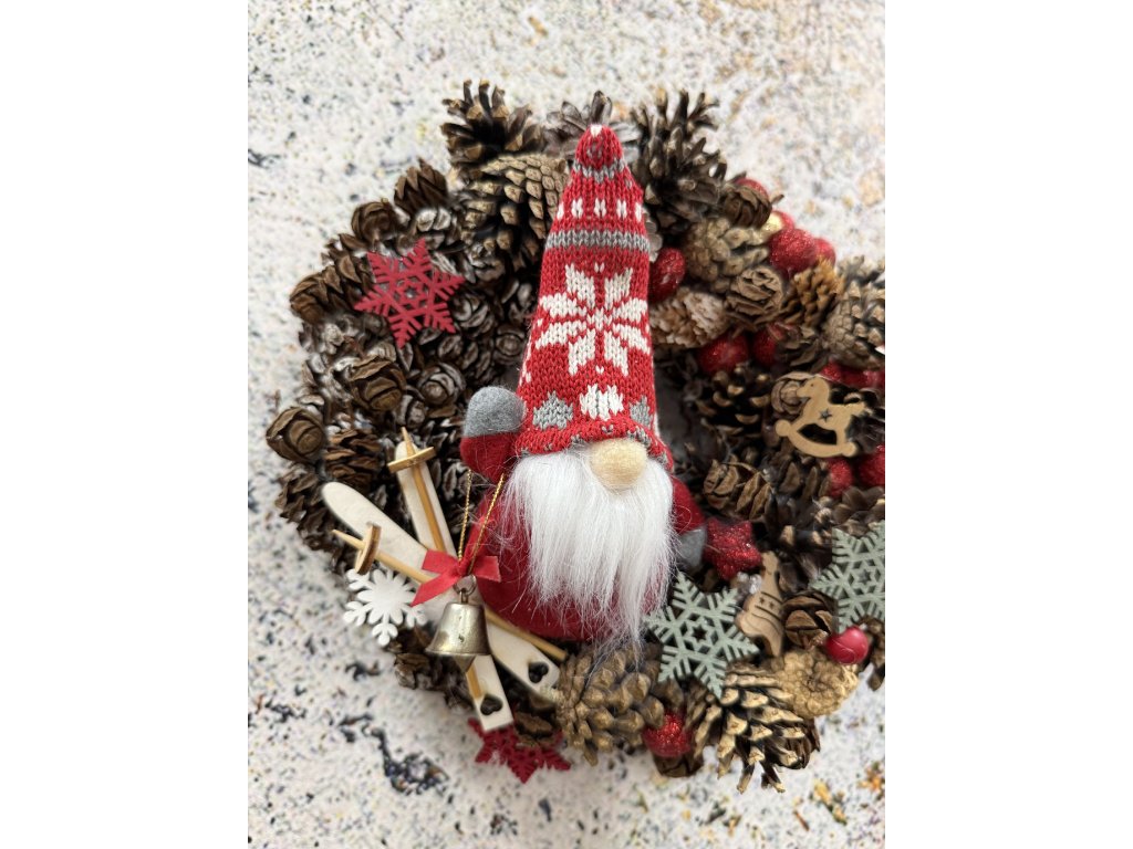 Rozkošný vánoční věnec vytvořený z přírodních šišek, dozdobený červenými kouličkami, vločkami a malými dřevěnými ozdobami. Dominantou je vánoční skřítek v červeném pleteném čepici, který drží lyže a malý zvoneček – jako by se právě chystal na zimní dobrodružství.