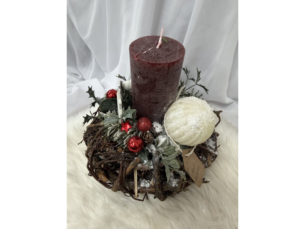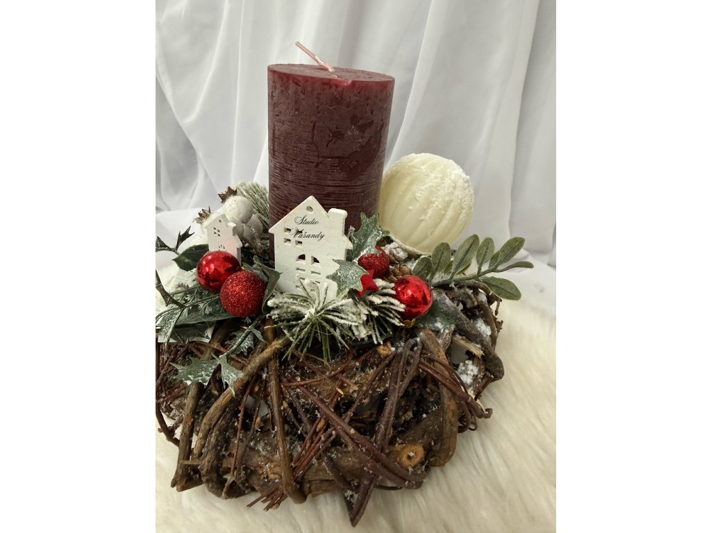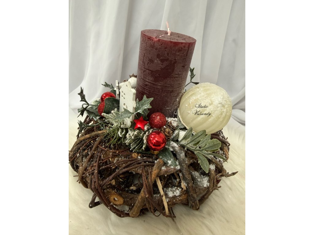 Přírodní proutěný věnec zdobený vínovou svíčkou, bílými domečky, červenými kouličkami a zasněženými větvičkami. Krásná zimní dekorace, která vnese do domova hřejivou atmosféru Vánoc.