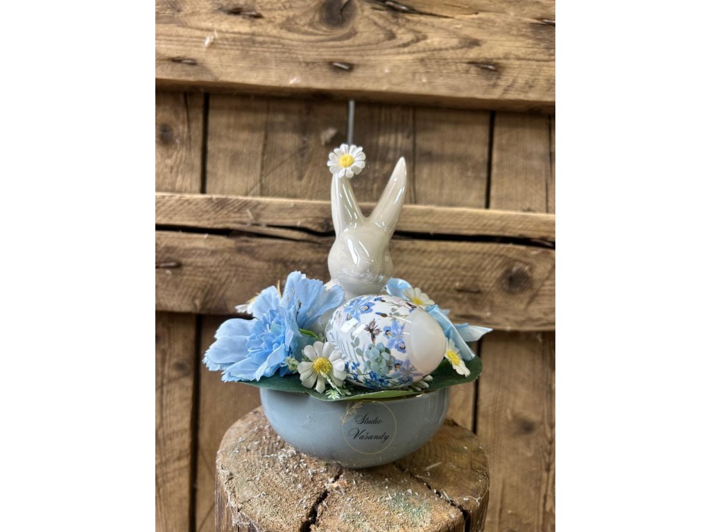 Svěží velikonoční aranžmá v blankytně modré barvě s keramickým zajíčkem, umělými květinami a dekorativním vajíčkem.