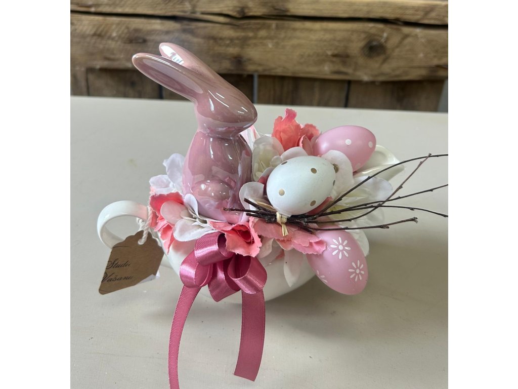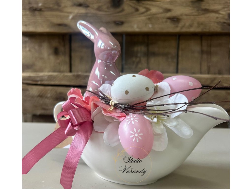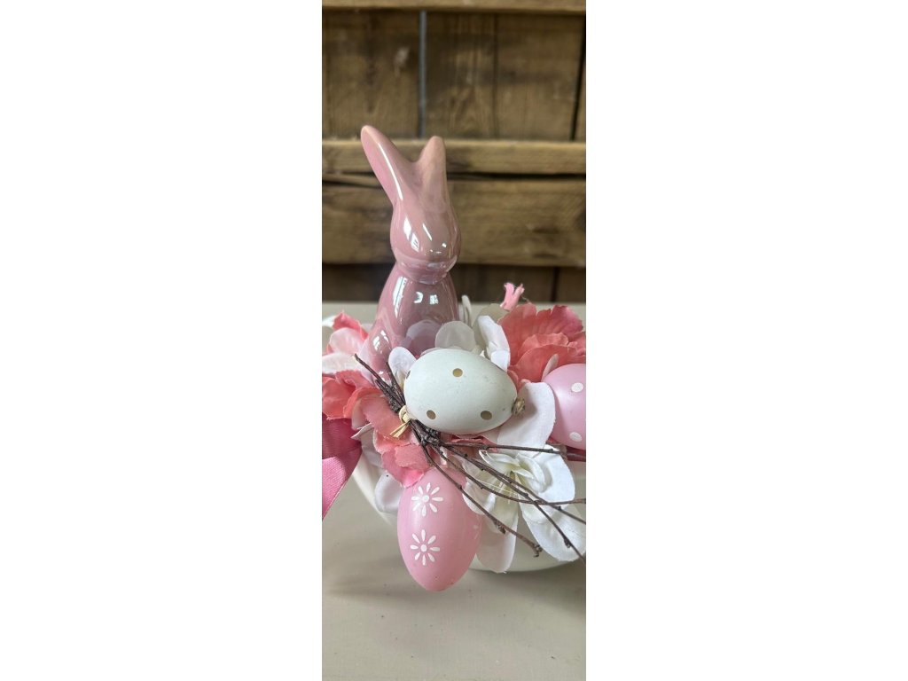 Velikonoční aranžmá v jemných růžových a lososových tónech je naaranžované v bílém keramickém omáčkovníku. Dominantou je keramický růžový zajíček doplněný vistárií, lososovými a bílými květy, dekorativními plastovými vajíčky a přírodními větvičkami. Saténová stuha dodává celé kompozici slavnostní nádech.
