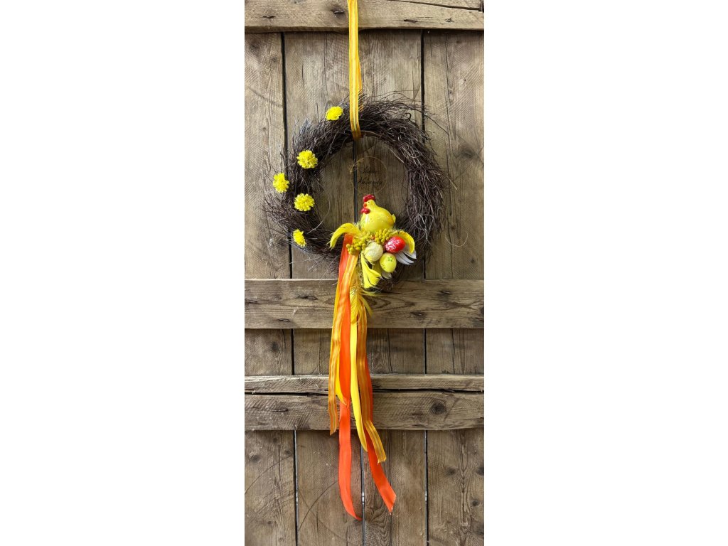 Veselý velikonoční věnec na zavěšení s keramickou slepičkou, jarními květy a barevnými detaily.
