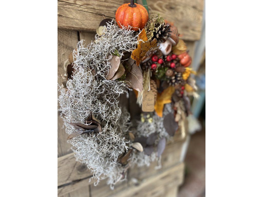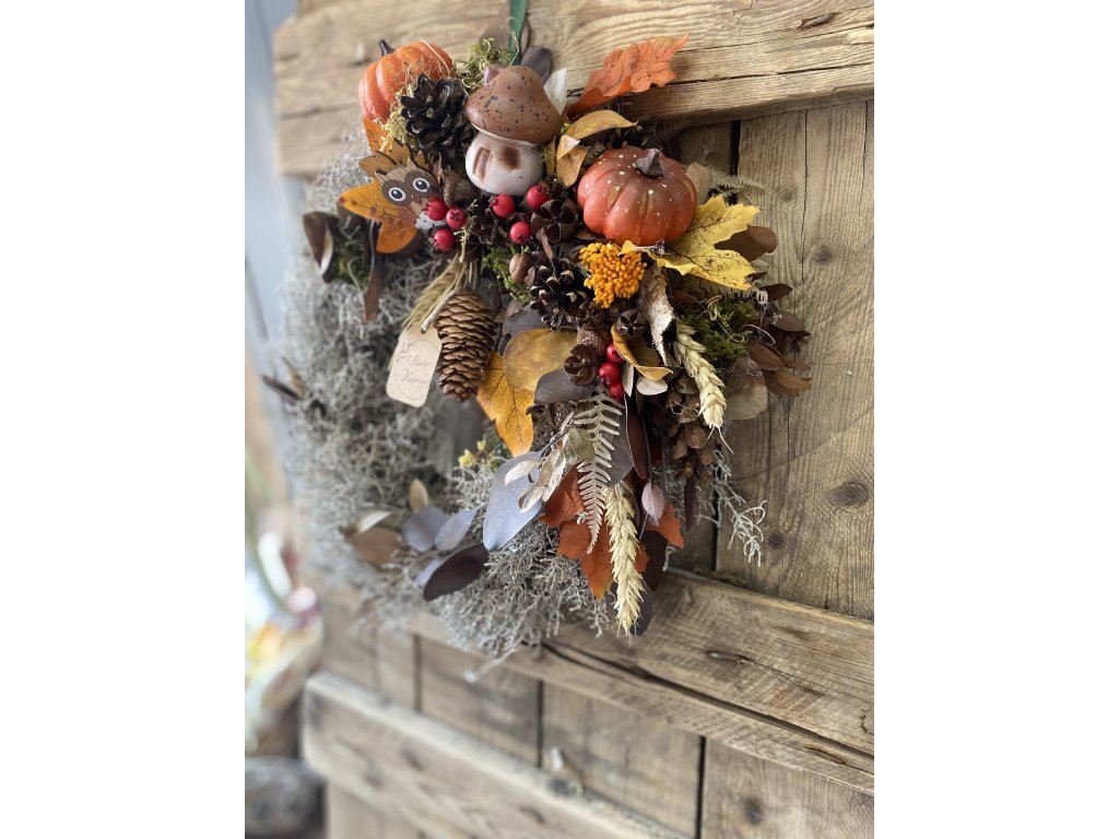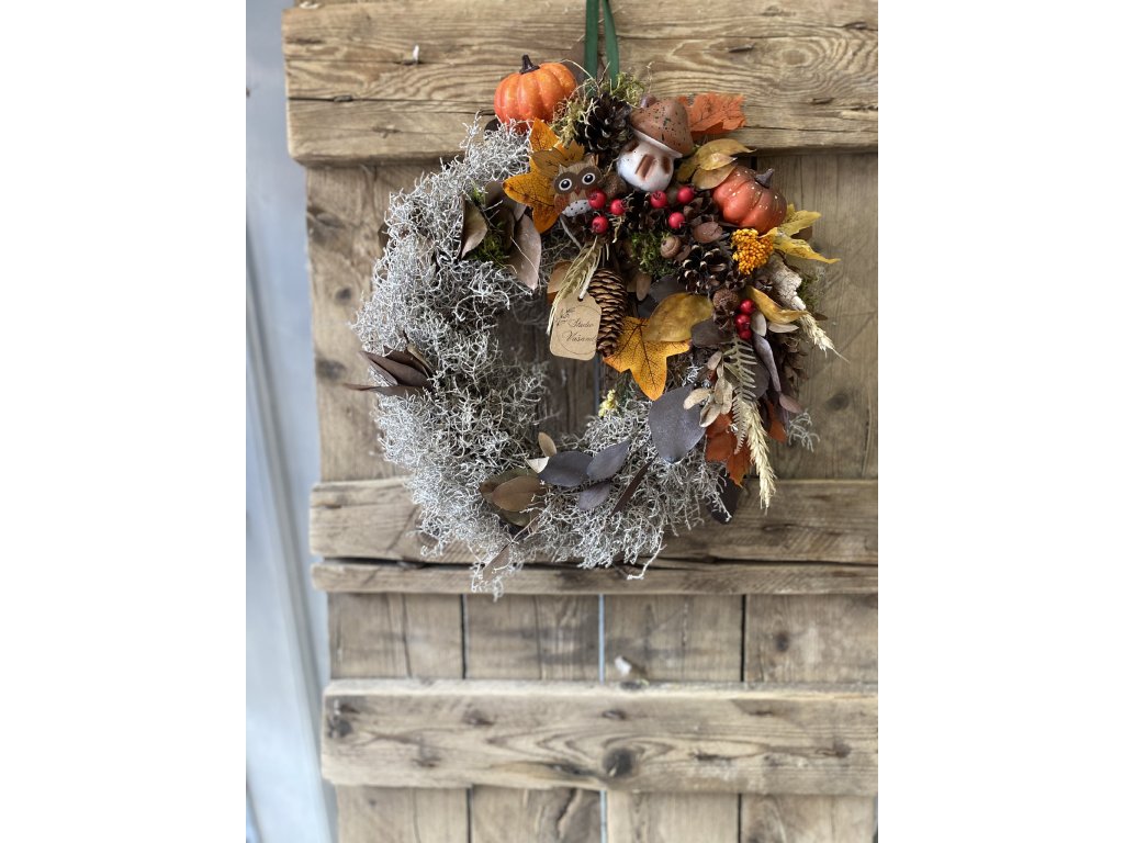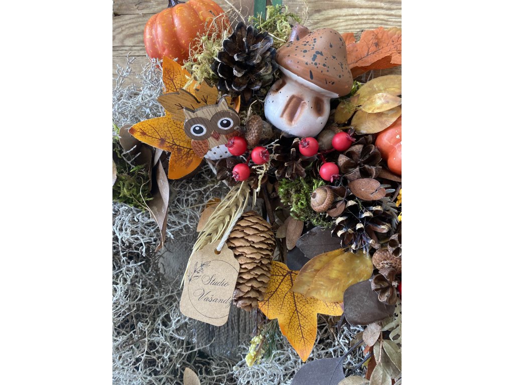 Věnec je vytvořen z umělých podzimních dekorací, stabilizovaného eukalyptu, přírodnin, dřevěné sovičky a keramické houbičky.