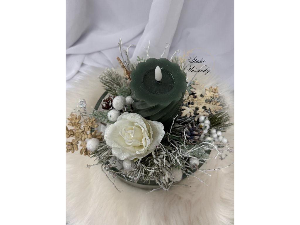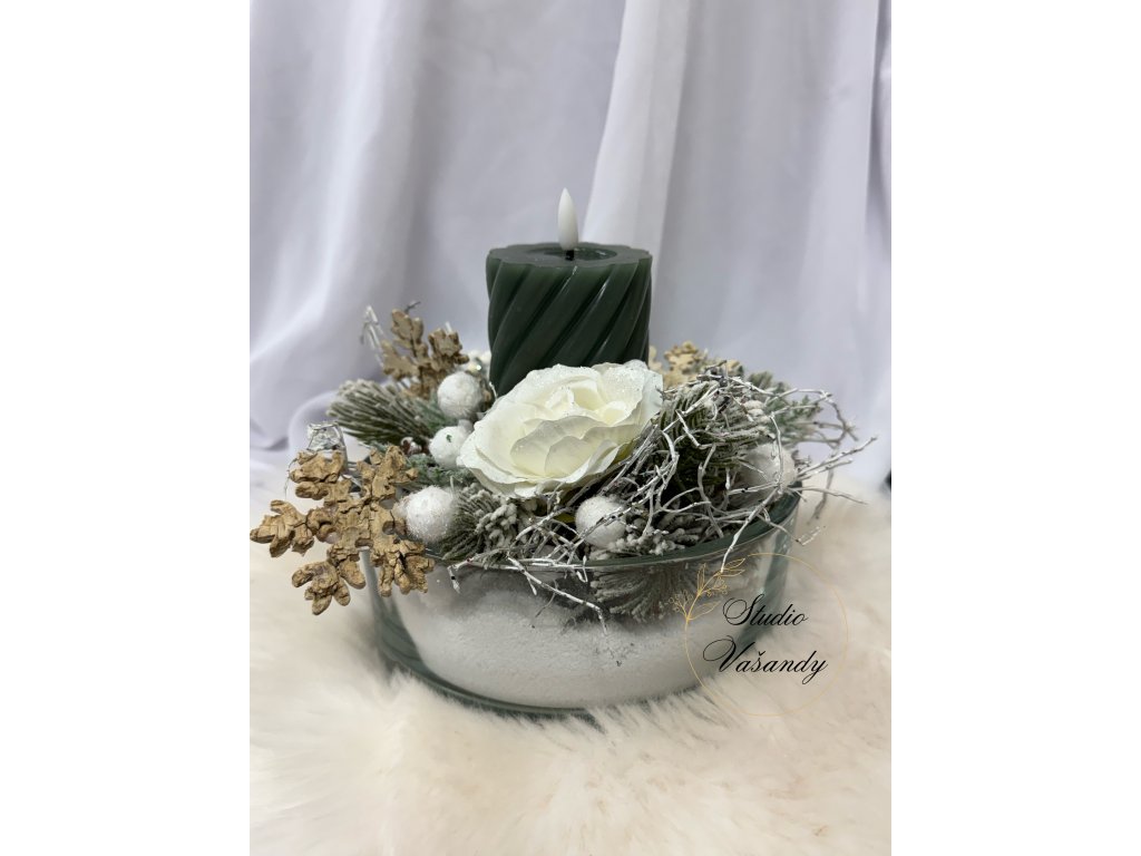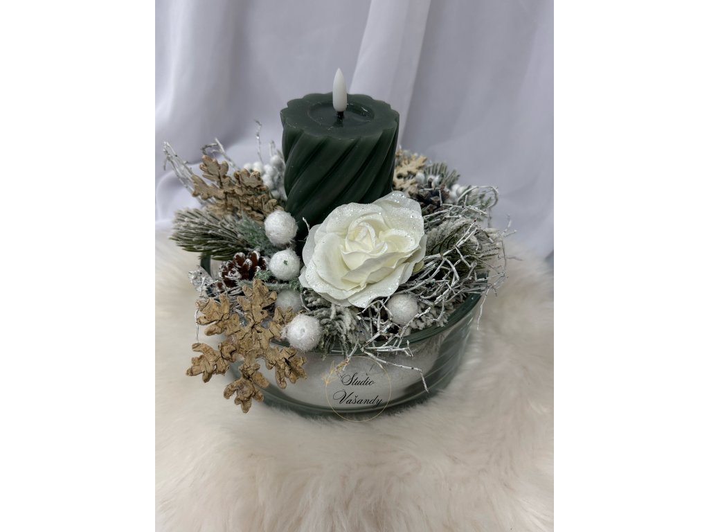 Krásná zimní dekorace v skleněné misce s tmavě zelenou svíčkou LED, která dodává celku přírodní a klidný nádech. Ozdobená je bílou růží, zasněženými větvičkami, šiškami a drobnými kouličkami. Zlaté vločky doplňují jemný třpyt a podtrhují sváteční atmosféru.