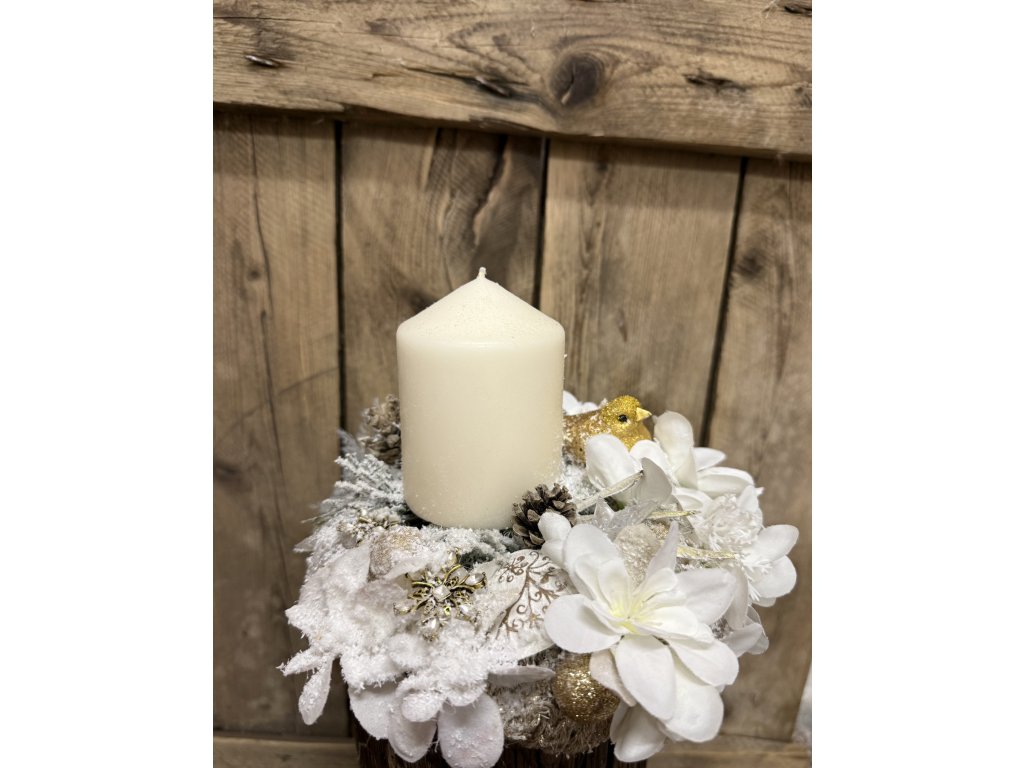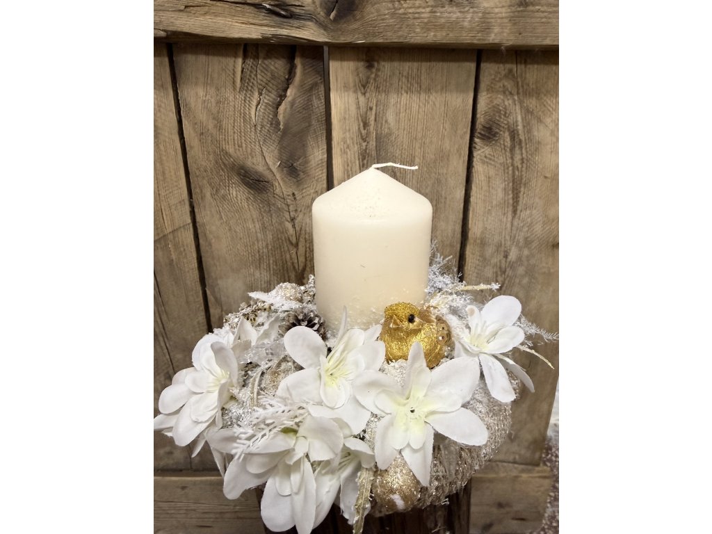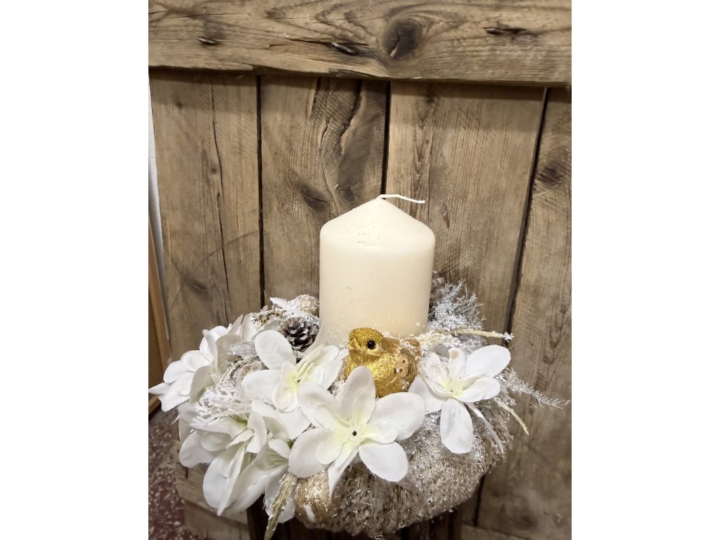 Jemná zimní dekorace laděná do bílo-zlatých tónů, která působí velmi čistě a slavnostně. Základem je pletený korpus ve zlaté barvě, doplněný o bílé květy, zasněžené větvičky, jemné detaily a drobné přírodní prvky. Součástí dekorace je také zlatý ptáček, který aranžmá dodává kouzelný vánoční akcent.