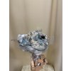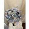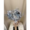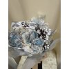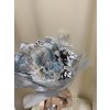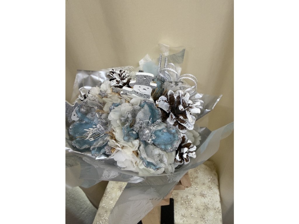 Nádherná zimní kytice laděná do bílomodré kombinace, doplněná o zasněžené šišky a roztomilého dřevěného sněhuláka. Dominantou jsou modré květy s jemným třpytem, které dodávají aranži jemný zimní nádech.