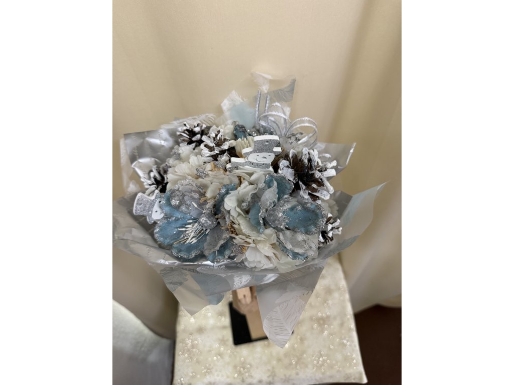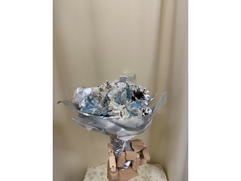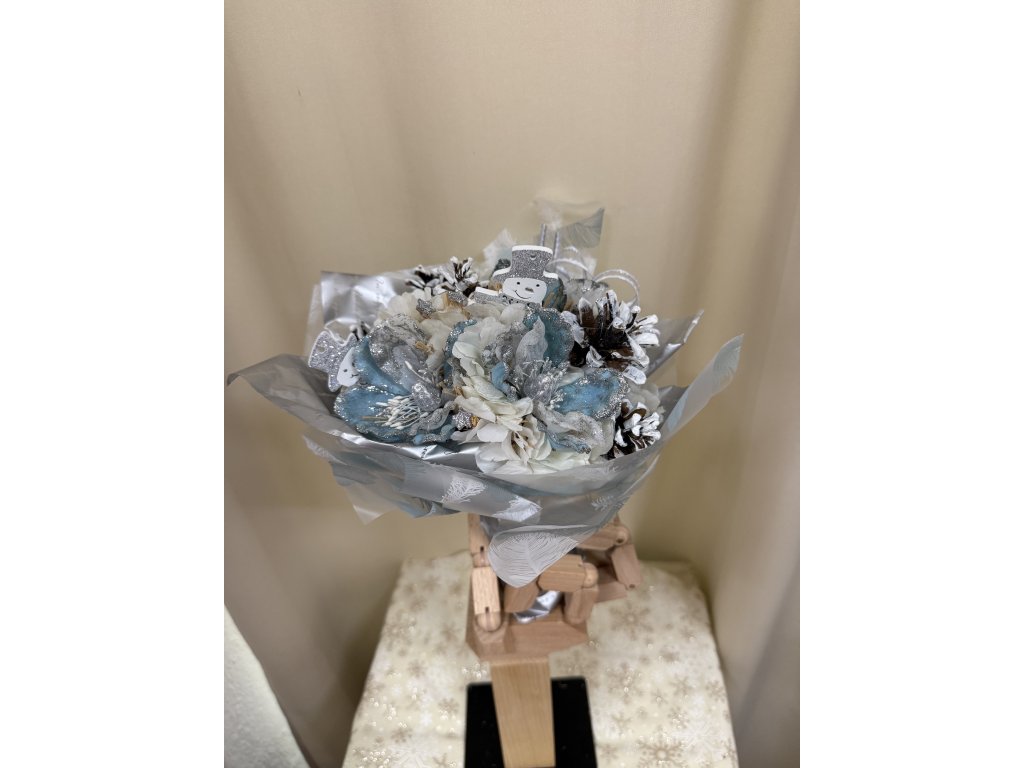 Kytice je zakončena dekorativní manžetou s potiskem zimních motivů a převázaná stuhou v bílo-stříbrném provedení.