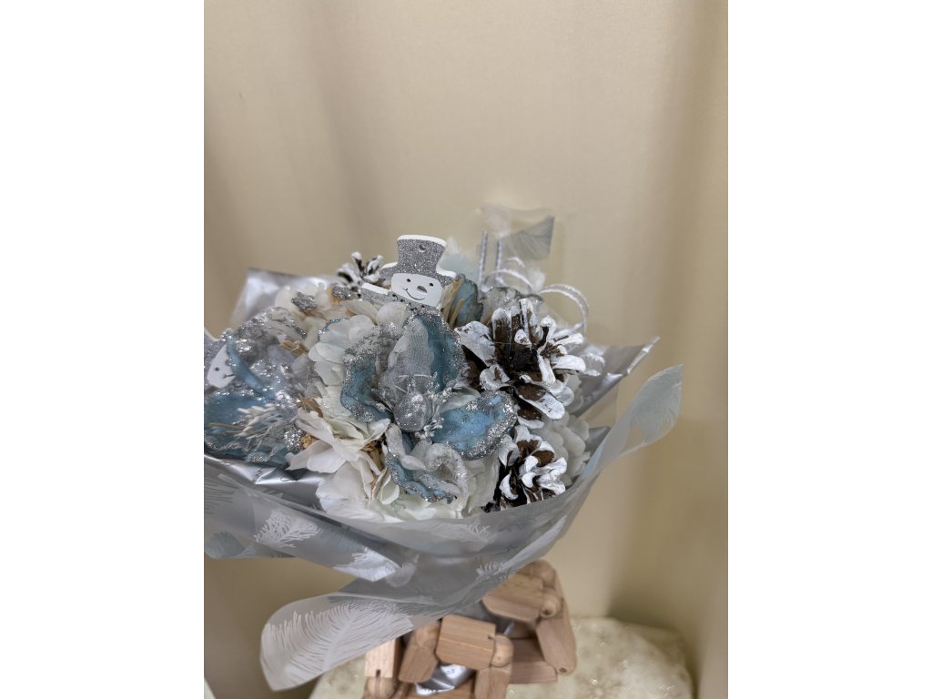 Nádherná zimní kytice laděná do bílomodré kombinace, doplněná o zasněžené šišky a roztomilého dřevěného sněhuláka. Dominantou jsou modré květy s jemným třpytem, které dodávají aranži jemný zimní nádech.