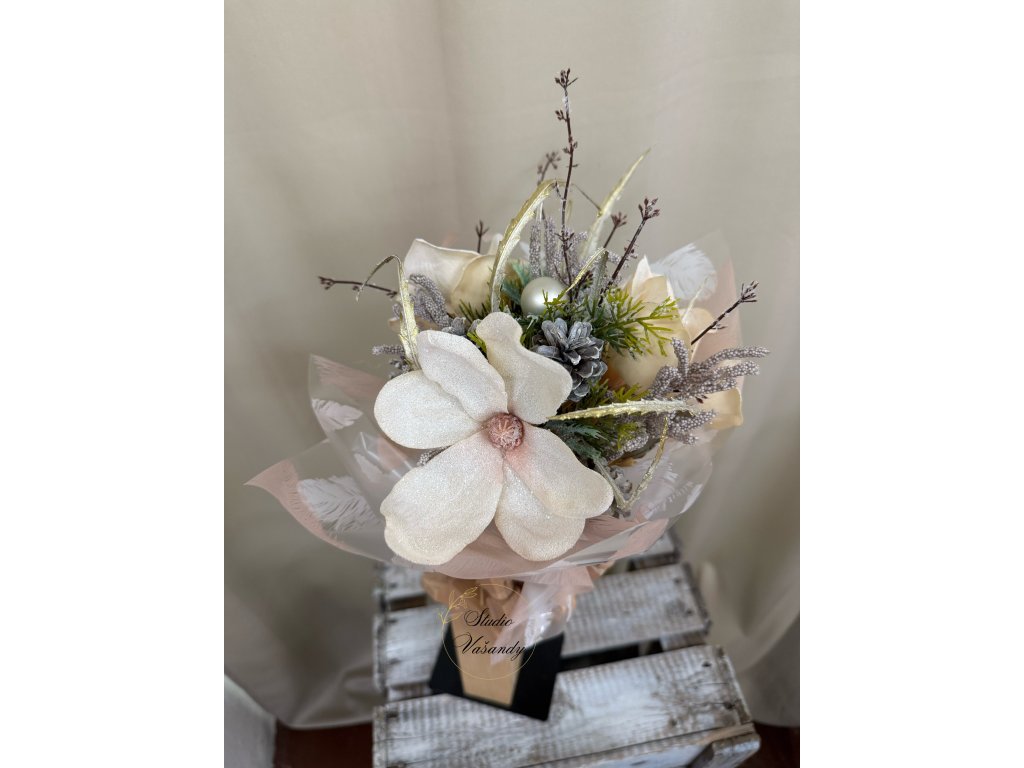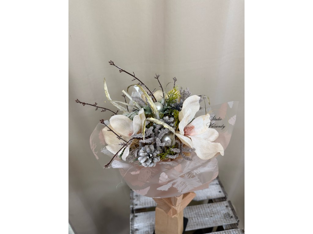 Jemná zimní kytice v krémových a zlatavých odstínech s výrazným květem, šiškami a zasněženými větvičkami. Doplňky s lehkým leskem dodávají kytici sváteční nádech a eleganci. Trvalé aranžmá, které vynikne jako zimní dekorace nebo dárek plný klidu a pohody.