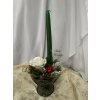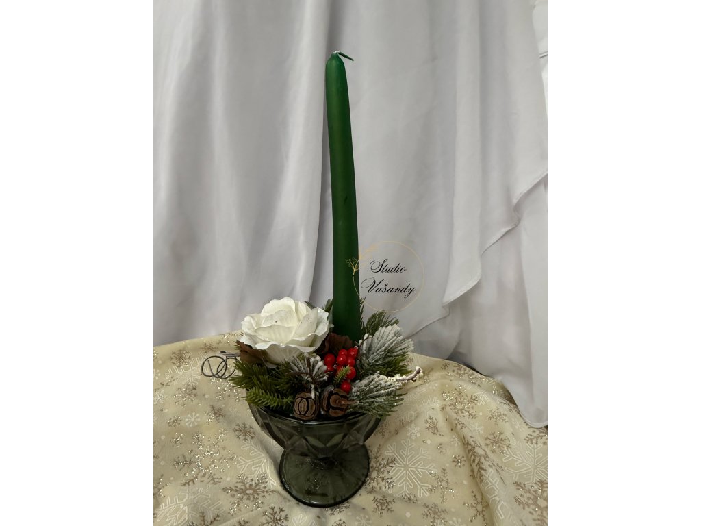 Jemná zimní dekorace ve skleněném poháru s vysokou smaragdově zelenou svíčkou.