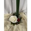 Zdobená umělou zasněženou růží, drobnými šiškami, červenými bobulkami a jehličím s lehkým mrazivým efektem. Působí čistě, zimně a krásně doplní stůl, poličku nebo okno v období adventu i Vánoc.