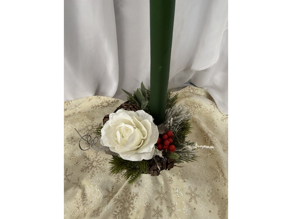 Zdobená umělou zasněženou růží, drobnými šiškami, červenými bobulkami a jehličím s lehkým mrazivým efektem. Působí čistě, zimně a krásně doplní stůl, poličku nebo okno v období adventu i Vánoc.