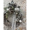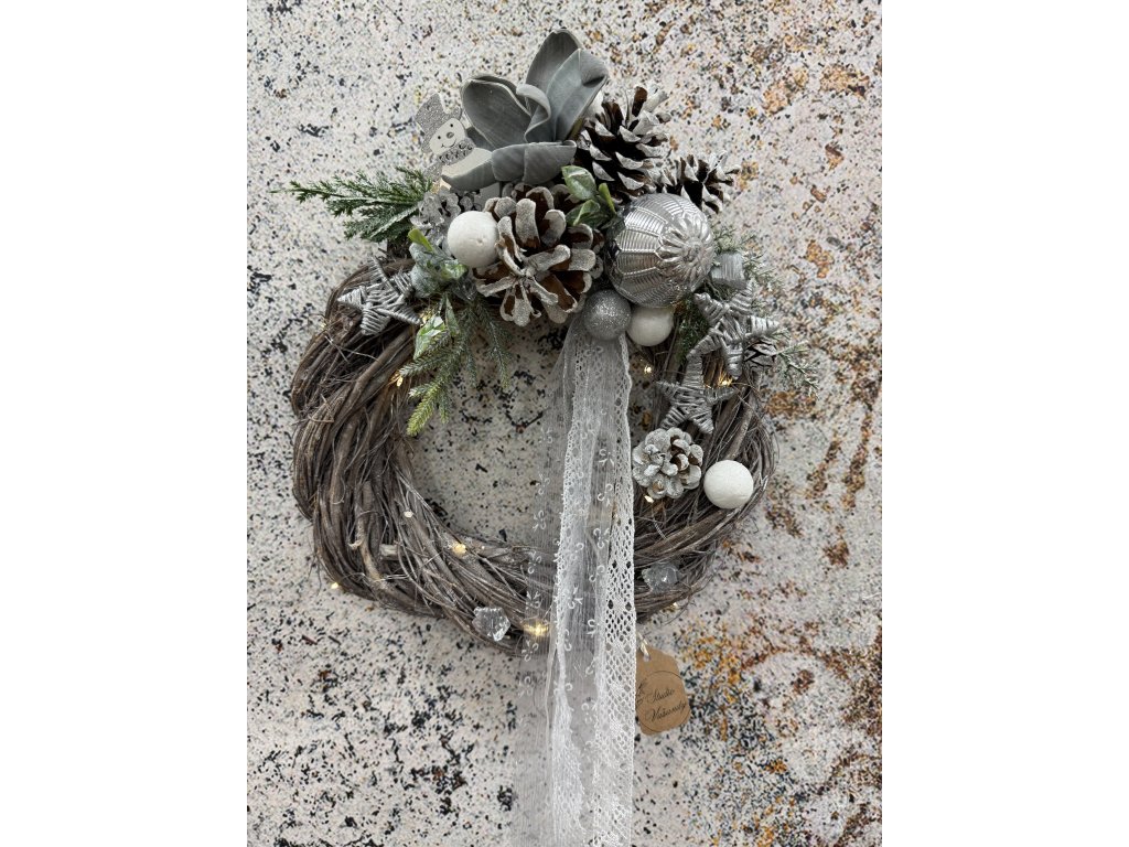 Zimní věnec laděný do přírodních a stříbrných tónů, zdobený zasněženými šiškami, dekorativní zelení, baňkami a jemnou krajkovou stuhou.