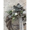 Základ tvoří přírodní proutěný korpus, který dodává věnci nadčasový, přírodní vzhled.Součástí zdobení je také malý dřevěný sněhulák, který celé aranži dodává zimní, hravý akcent.