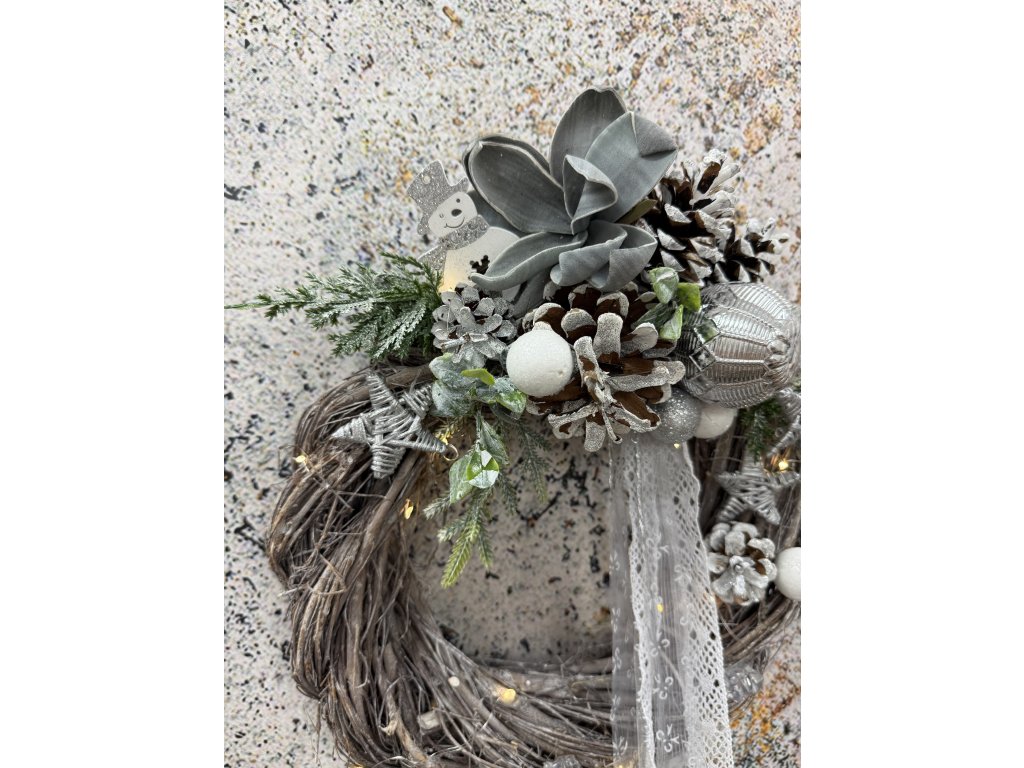 Základ tvoří přírodní proutěný korpus, který dodává věnci nadčasový, přírodní vzhled.Součástí zdobení je také malý dřevěný sněhulák, který celé aranži dodává zimní, hravý akcent.