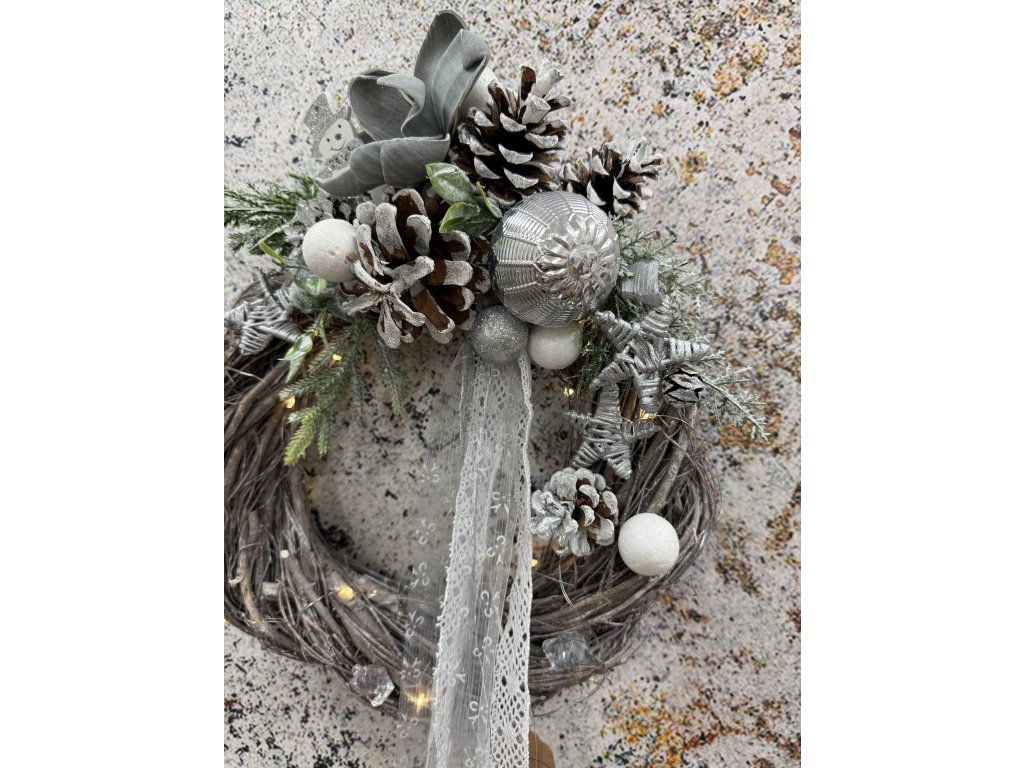 Zimní věnec laděný do přírodních a stříbrných tónů, zdobený zasněženými šiškami, dekorativní zelení, baňkami a jemnou krajkovou stuhou.