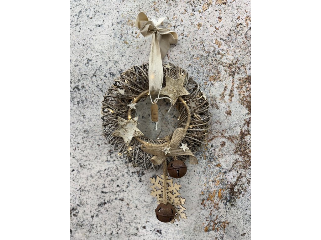 Věnec na dveře s rolničkou a vločkami , svítící, průměr 28 cm